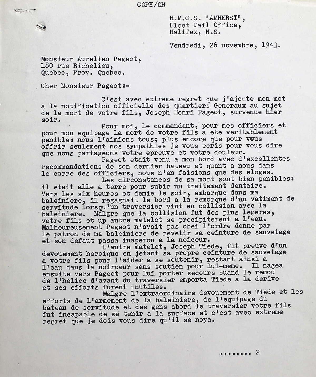 PAGEOT, Joseph Henri, Stwd, V/3754, RCNVR, died - 25 Nov 1943, HMCS AMHERST - Son of Mr. and Mrs. Aurelien Pageot, Québec City, QC.