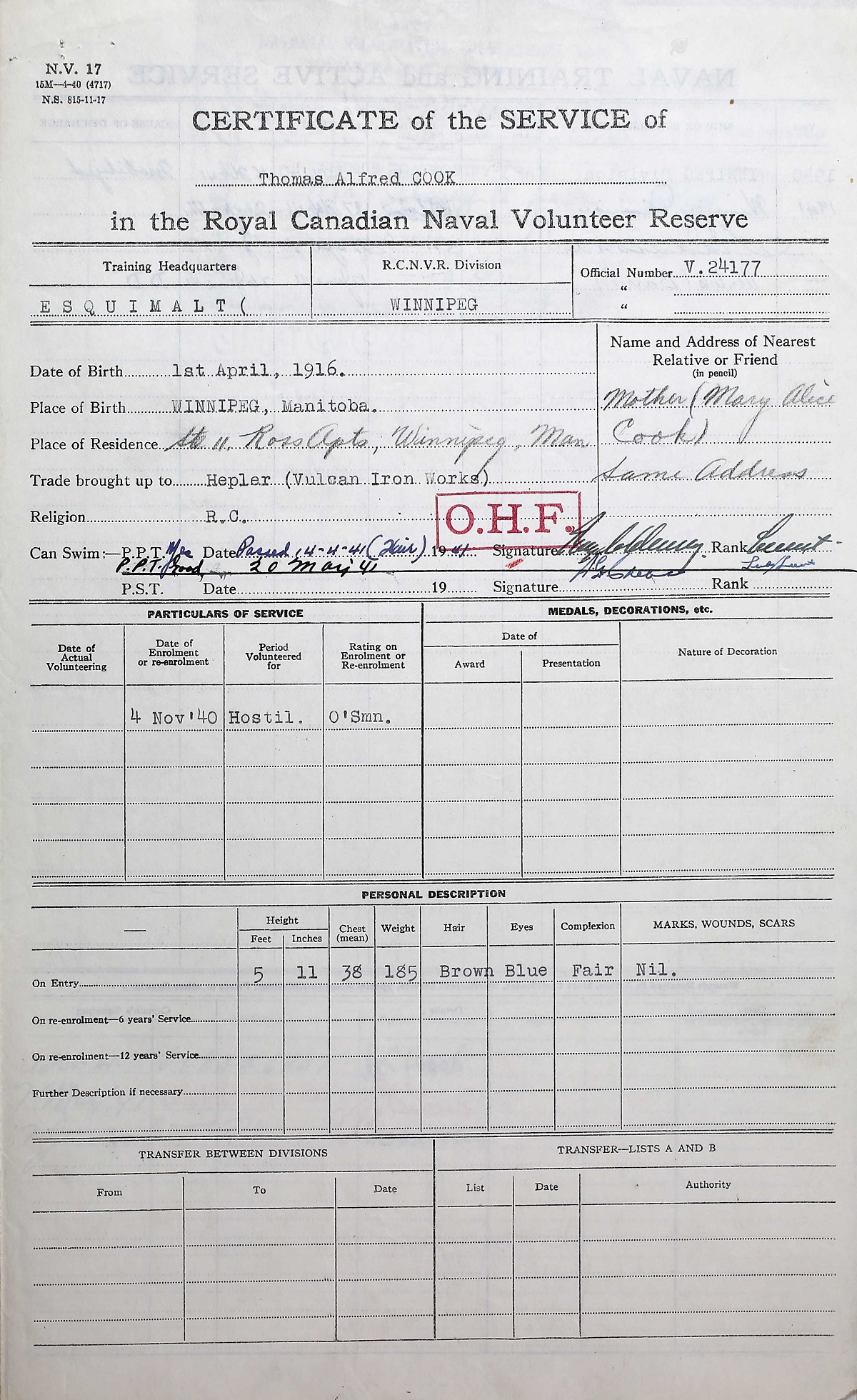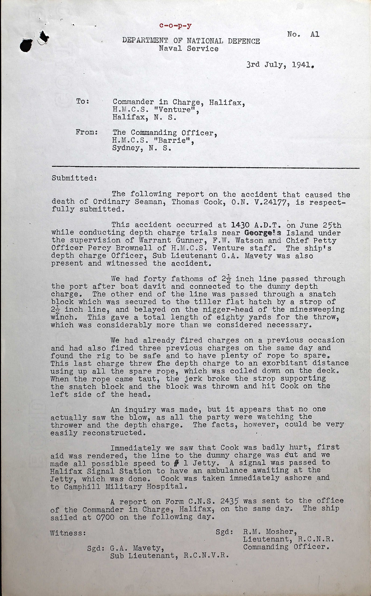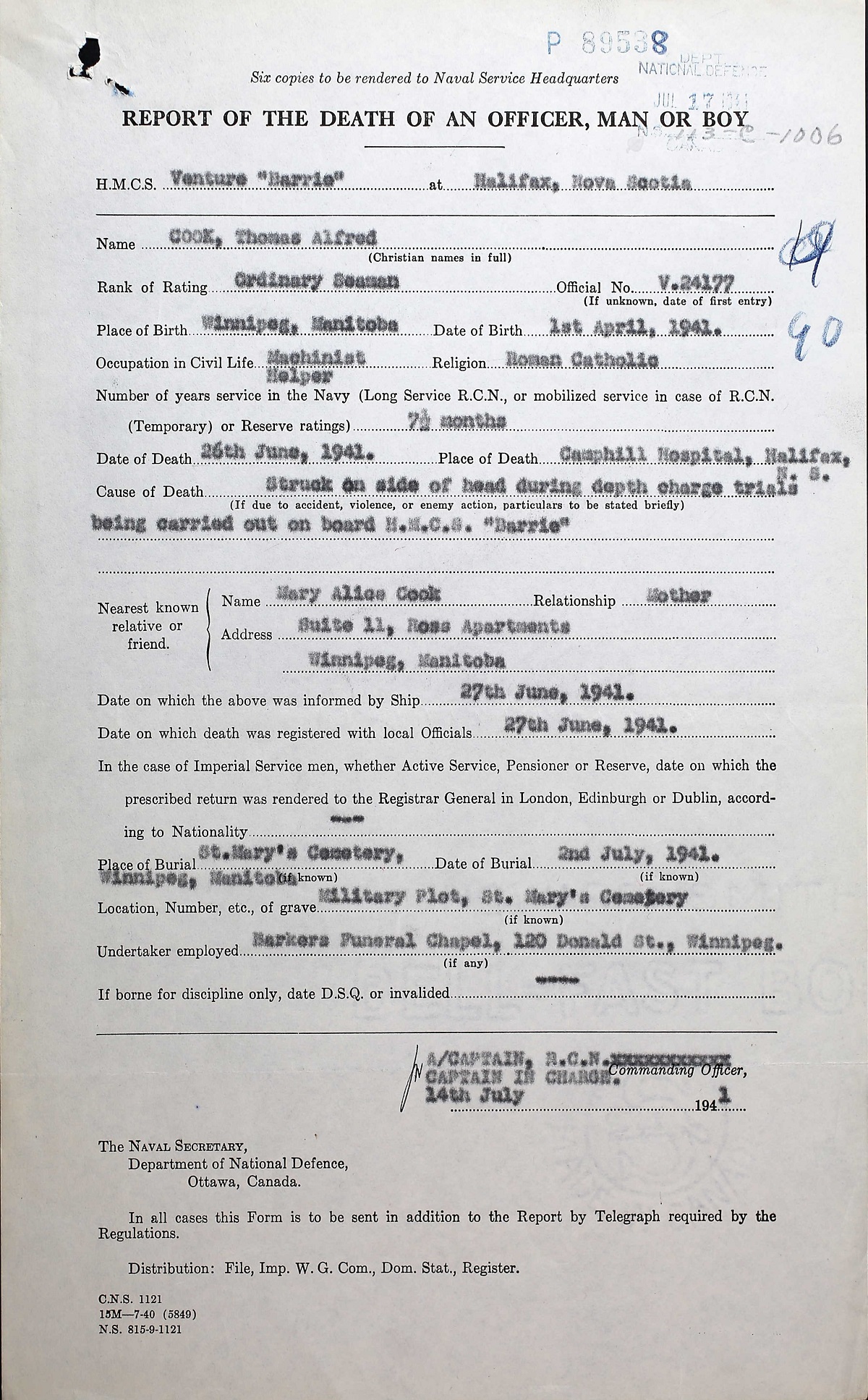 Thomas Cook was a machinist helper before joining the navy and was formerly a star Winnipeg rugby player. He died of injuries in Camp Hill Hospital, Halifax, NS after being struck on the side of the head during depth charge trials being carried out on board HMCS BARRIE. He been in the navy for only 7 1/2 months.