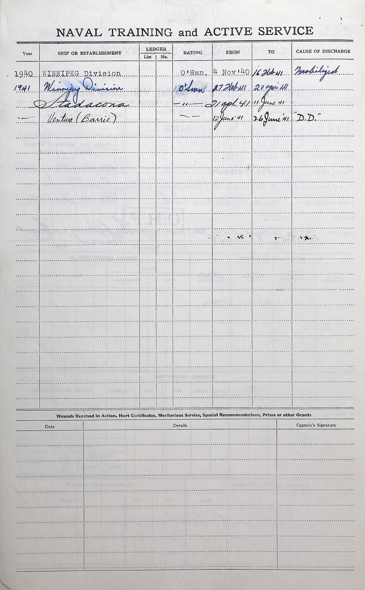 Ships served in: RCNVR DIVISION WINNIPEG - Enlisted 04 Nov 1940. Commenced Active Service 16 Feb 1941 HMCS BARRIE - Drafted to BARRIE 12 Jun 1941 as an OS, RCNVR