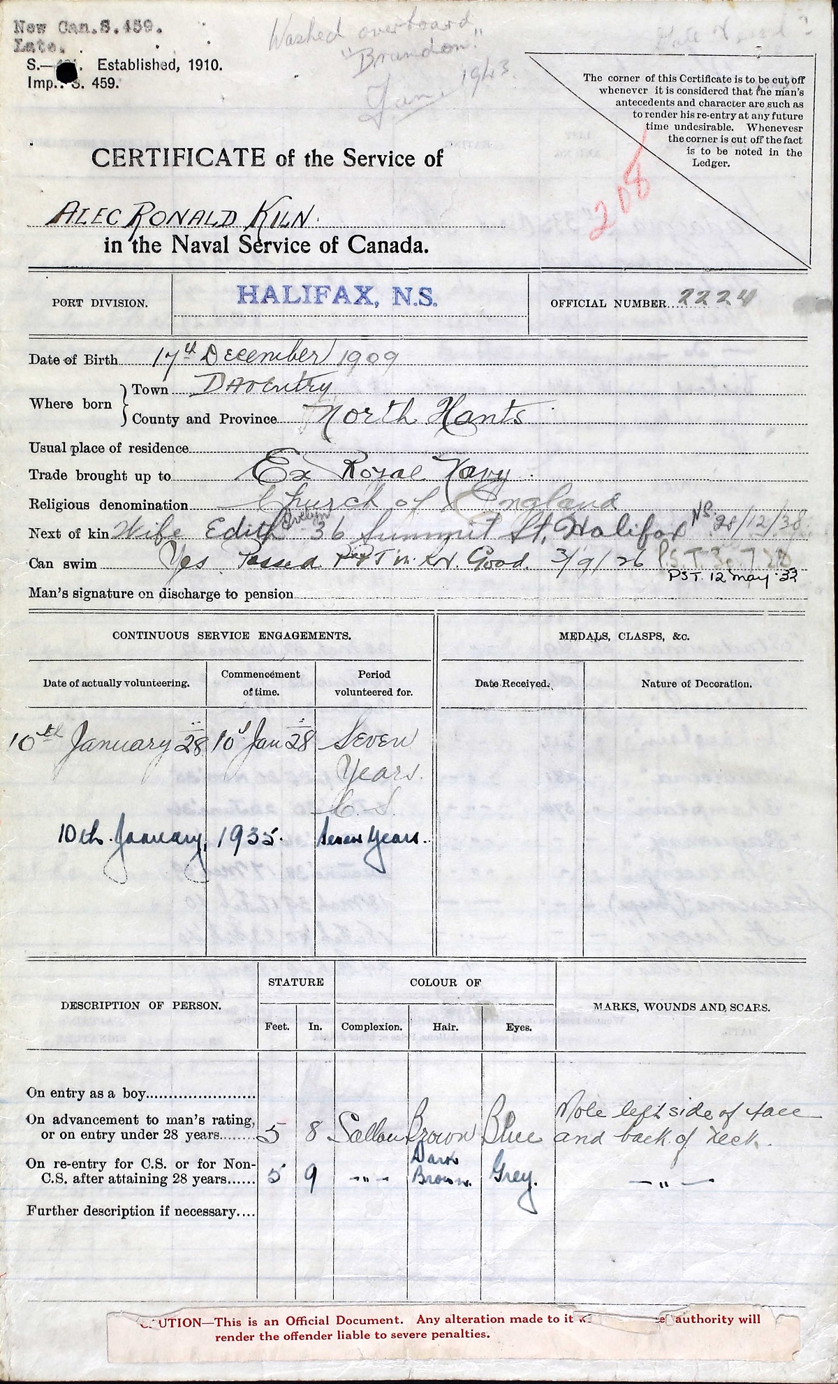 Leading Seaman A. R. Kiln died when he fell overboard between 19:30 and 20:00 hours on the night of December 20, 1942, whilst HMCS Brandon was escorting the Iceland portion of convoy 112. An investigation showed he fell over the side by accident and was drowned, in the execution of his duty.