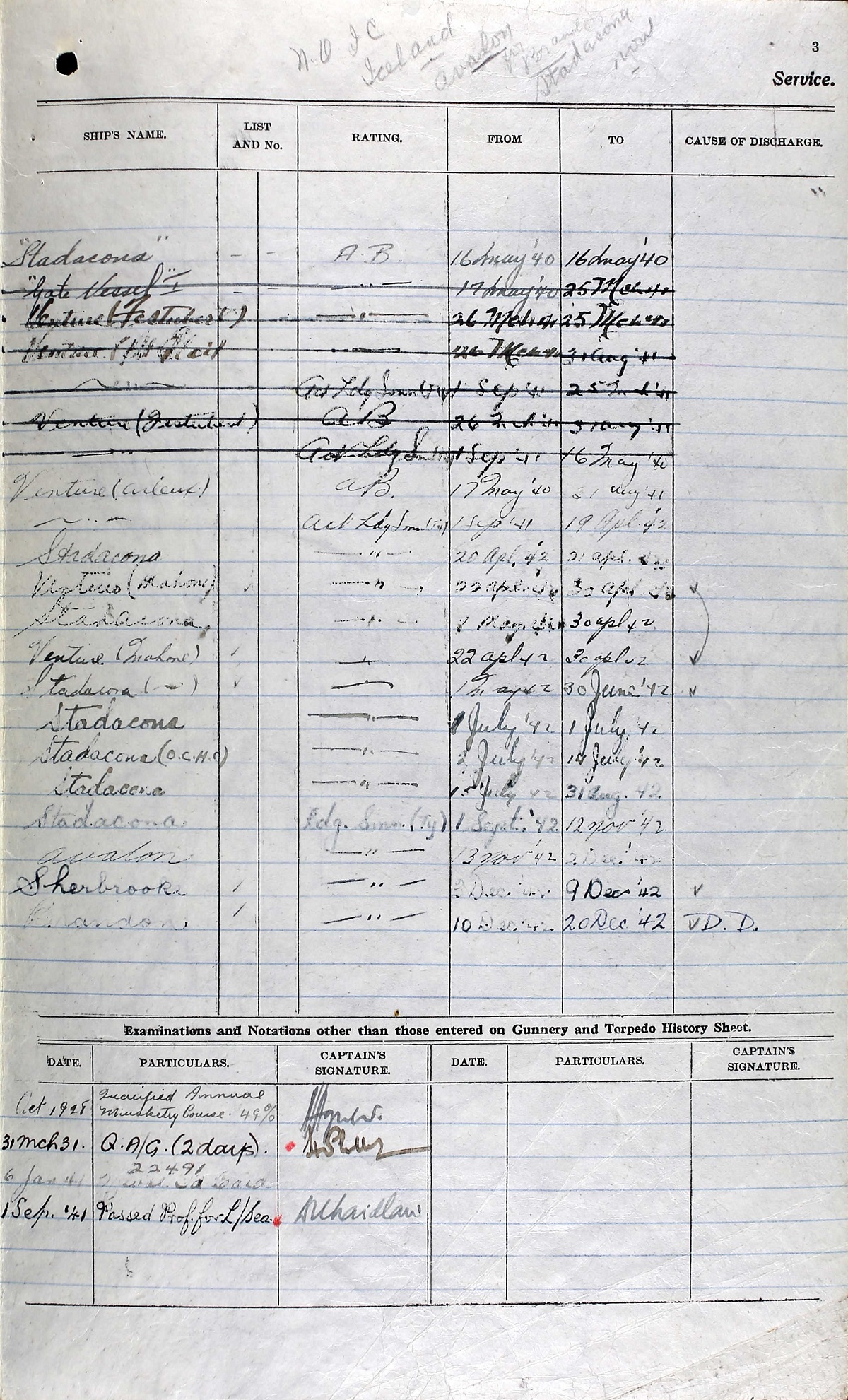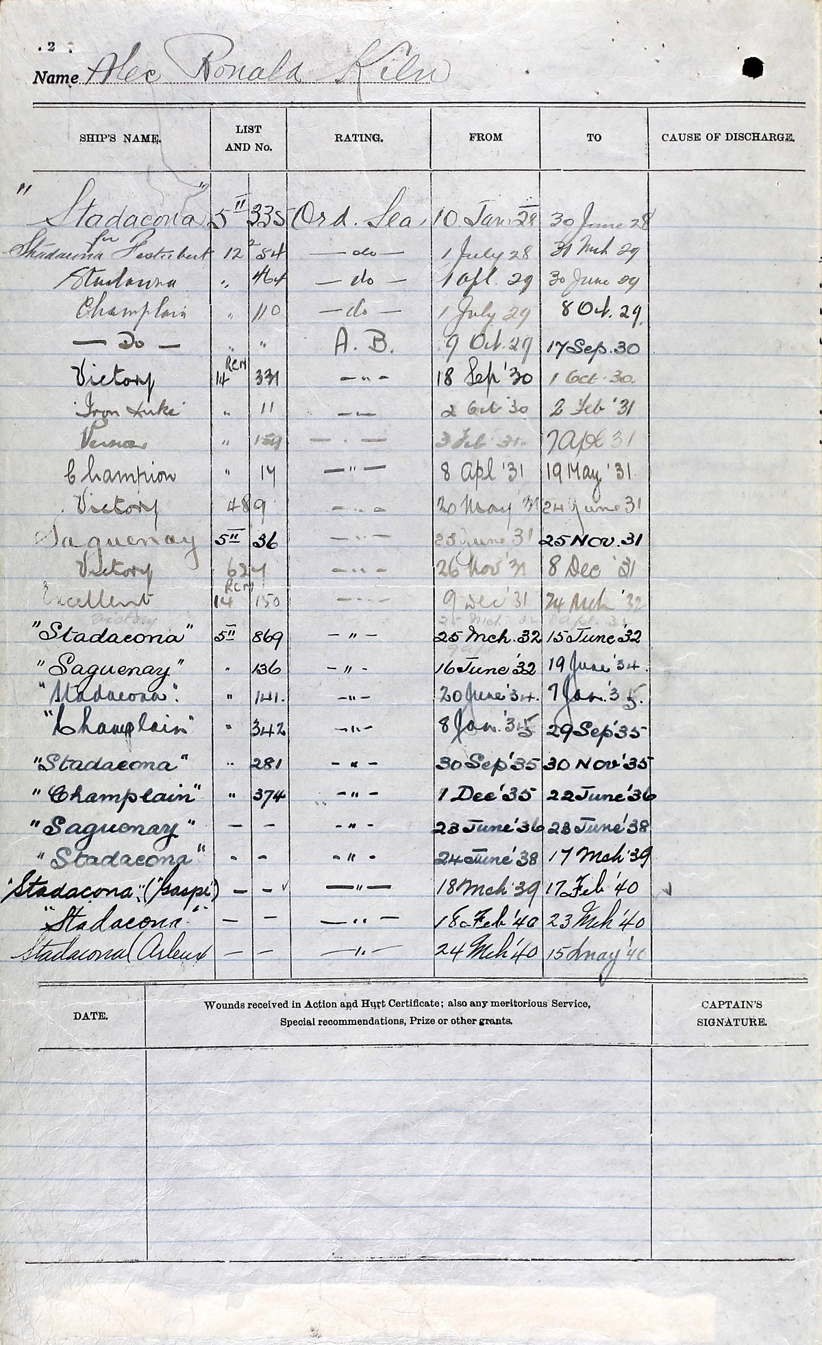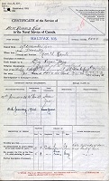 Ships served in: HMCS FESTUBERT - Served in FESTUBERT 01 Jul 1928 - 30 Mar 1929 as an OS, RCN HMCS CHAMPLAIN - Served in CHAMPLAIN 01 Jul 1929 - 17 Sep 1930 as an OS and AB, RCN. Rated AB 09 Oct 1929 HMS VICTORY - Served in VICTORY 18 Sep 1930 - 01 Oct 1930 as an AB, RCN HMS IRON DUKE (Iron Duke Class Battleship) - Served in IRON DUKE 02 Oct 1930 - 02 Feb 1931 HMS CHAMPION (RN C-Class Light Cruiser) - 08 Apr 1931 - 19 May 1931 as an AB, RCN HMS VICTORY - Served in VICTORY 20 May 1931 - 24 Jun 1931 as an AB, RCN HMCS SAGUENAY - Served in SAGUENAY 25 Jun 1931 - 25 Nov 1931 HMS VICTORY - Served in VICTORY 26 Nov 1931 - 08 Dec 1931 as an AB, RCN HMCS SAGUENAY - Served in SAGUENAY 16 Jun 1932 - 19 Jun 1934 as an AB, RCN HMCS CHAMPLAIN - Served in CHAMPLAIN 08 Jan 1935 - 29 Sep 1935 as an AB, RCN HMCS CHAMPLAIN - Served in CHAMPLAIN 01 Dec 1935 - 22 Jun 1936 as an AB, RCN HMCS SAGUENAY - Served in SAGUENAY - 23 Jun 1936 - 23 Jun 1938 as an AB, RCN HMCS GASPE - Served in GASPE 18 Mar 1939 - 17 Feb 1940 as an AB, RCN HMCS ARLEUX - Served in ARLEUX 24 Mar 1940 - 19 Apr 1942 as an AB and A/LS, RCN. Rated A/LS 01 Sep 1941 HMCS MAHONE - Served in MAHONE 22 Apr 1942 - 30 Jun 1942 as an A/LS, RCN HMCS SHERBROOKE - Served in SHERBROOKE 02 Dec 1942 - 09 Dec 1942 as a LS, RCN HMCS BRANDON - Drafted to BRANDON 10 Dec 1942 as a LS, RCN