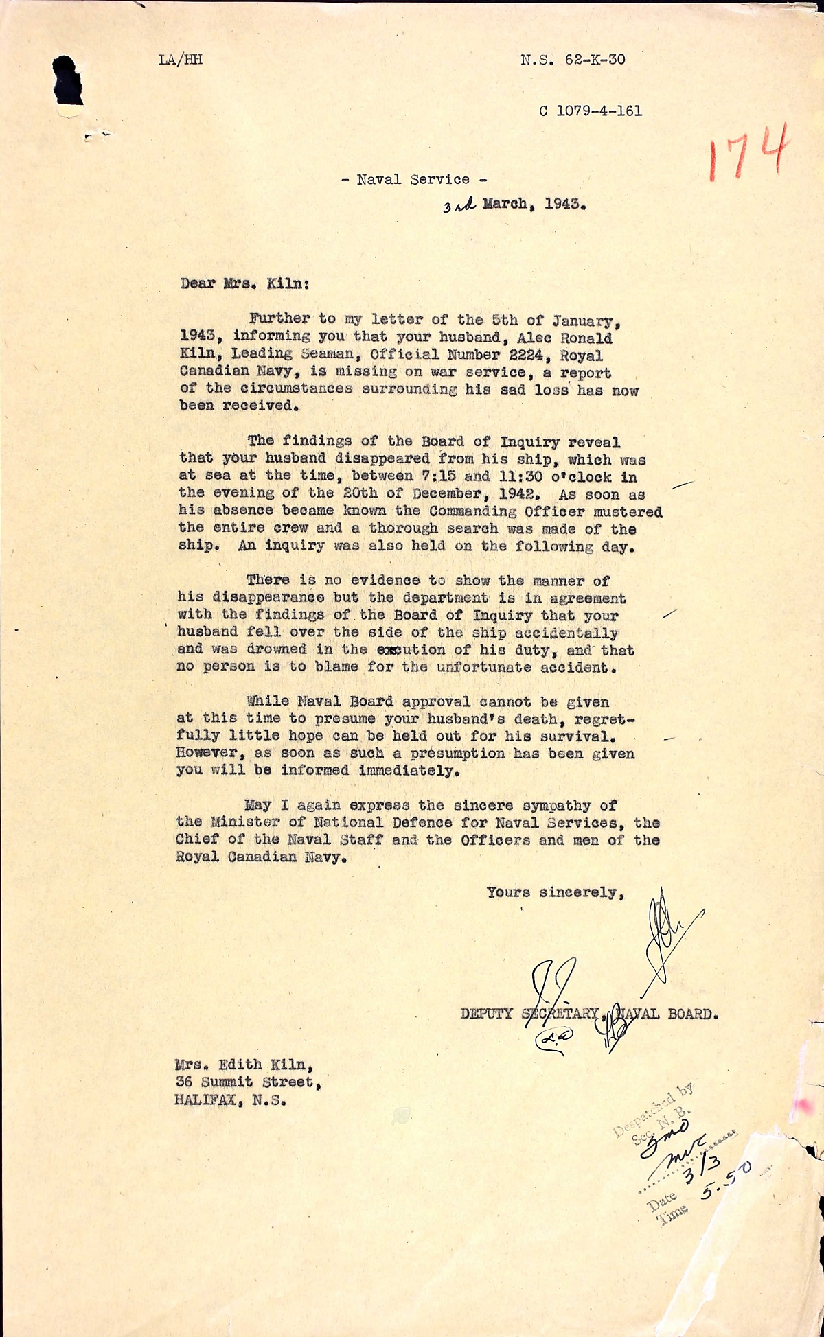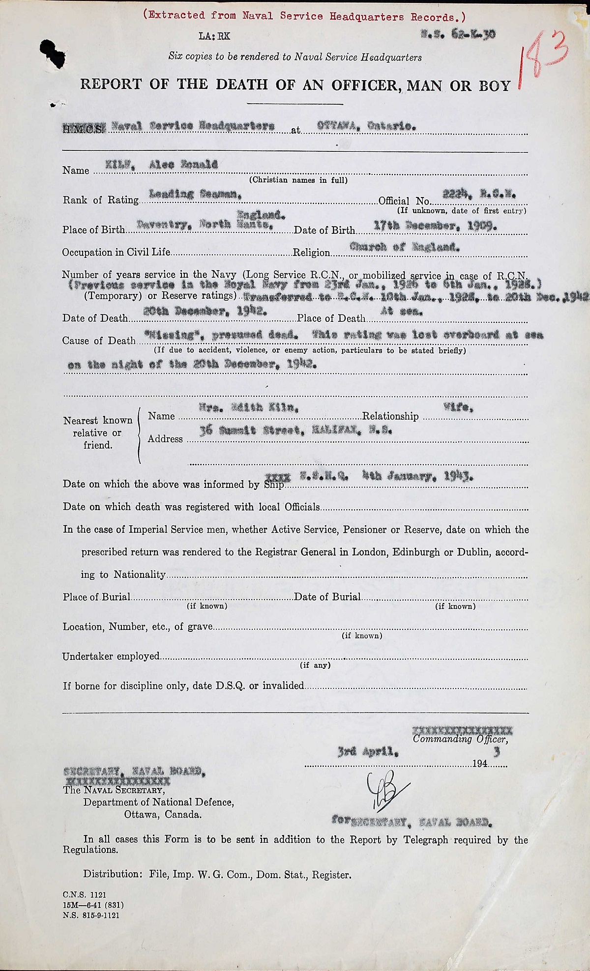 KILN, Alec Ronald, LS, 2224, RCN, MPK - 20 Dec 1942, HMCS BRANDON - son of Harry and Mary Kiln, Weymouth, Dorsetshire, England; husband of Edith Evelyn Kiln, Halifax, NS.