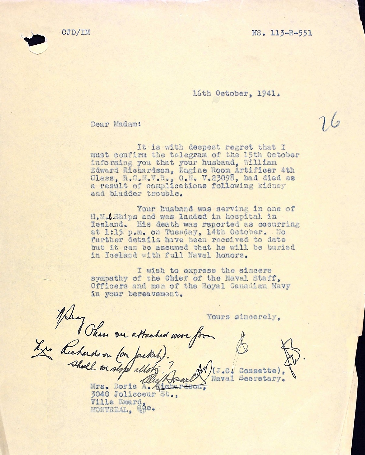 RICHARDSON, William Edward, ERA 4c, V23098, RCNVR, died - 14 Oct 1941, HMCS BRANDON - Son of William and Margret Richardson, of Montreal; husband of Doris Amy Richardson, all of Montreal, QC.