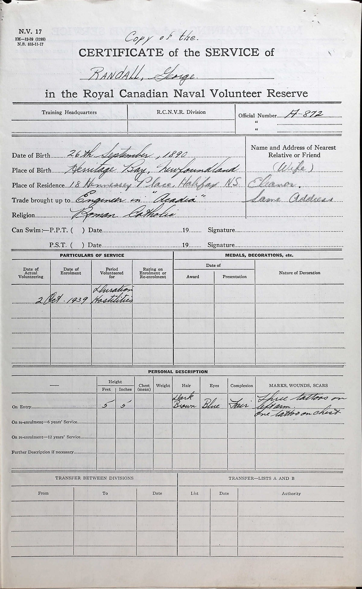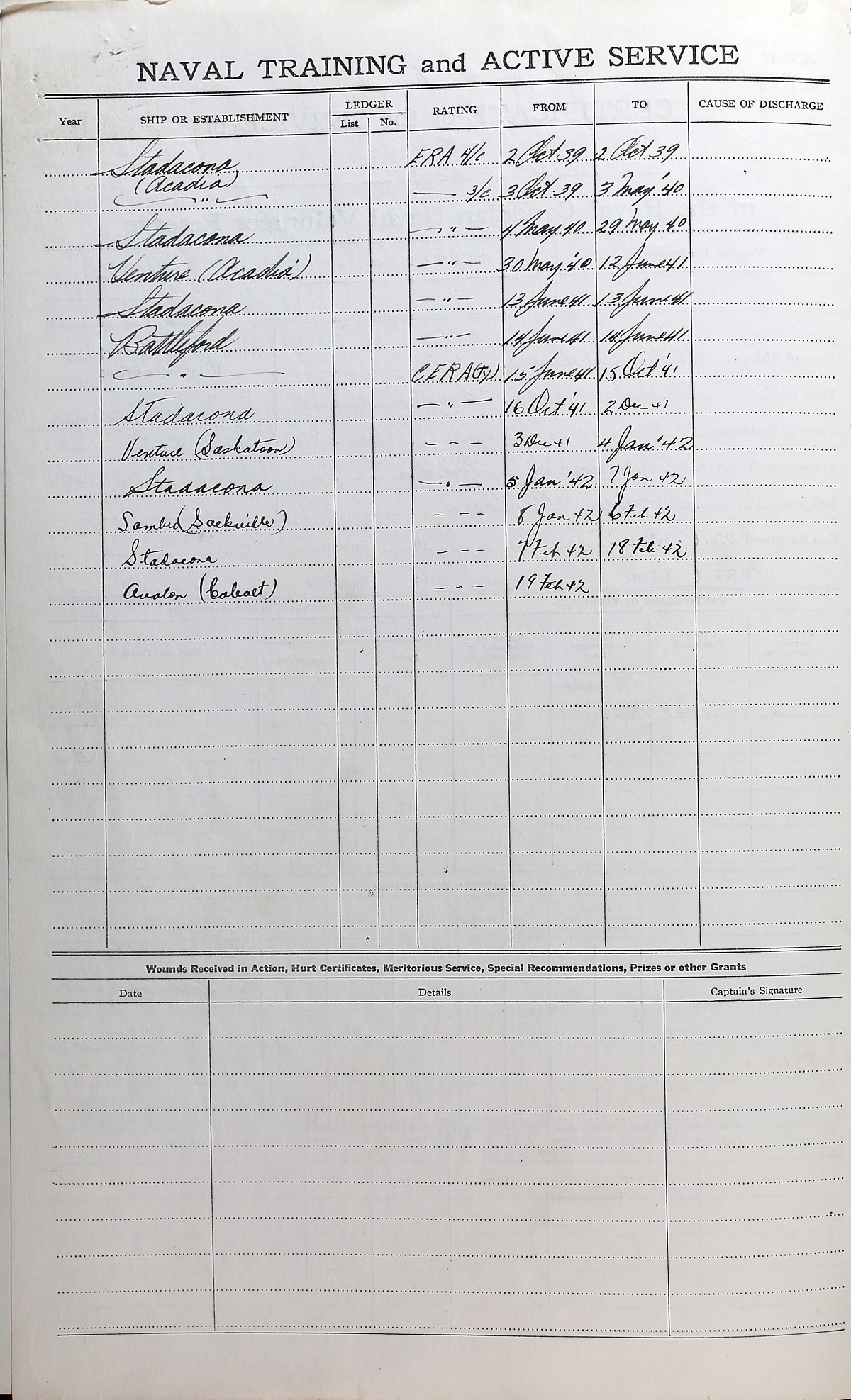 Ships served in: HMCS ACADIA - Served in ACADIA 02 Oct 1939 - 03 May 1940 as an ERA 4c and ERA 3c, RCNR. Rated ERA 3c on 03 Oct 1939 HMCS ACADIA - Served in ACADIA 30 May 1940 - 12 Jun 1941 as an ERA 3c, RCNR HMCS BATTLEFORD - Served in BATTLEFORD 14 Jun 1941 - 15 Oct 1941 as an ERA 3c and CERA, RCNR. Rated CERA 15 Jun 1941 HMCS SASKATOON - Served in SASKATOON 03 Dec 1941 - 04 Jan 1942 as a CERA, RCNR HMCS SACKVILLE - Served in SACKVILLE 08 Jan 1942 - 06 Feb 1942 as a CERA, RCNR HMCS COBALT - Drafted to COBALT 19 Feb 1942 as a CERA, RCNR
