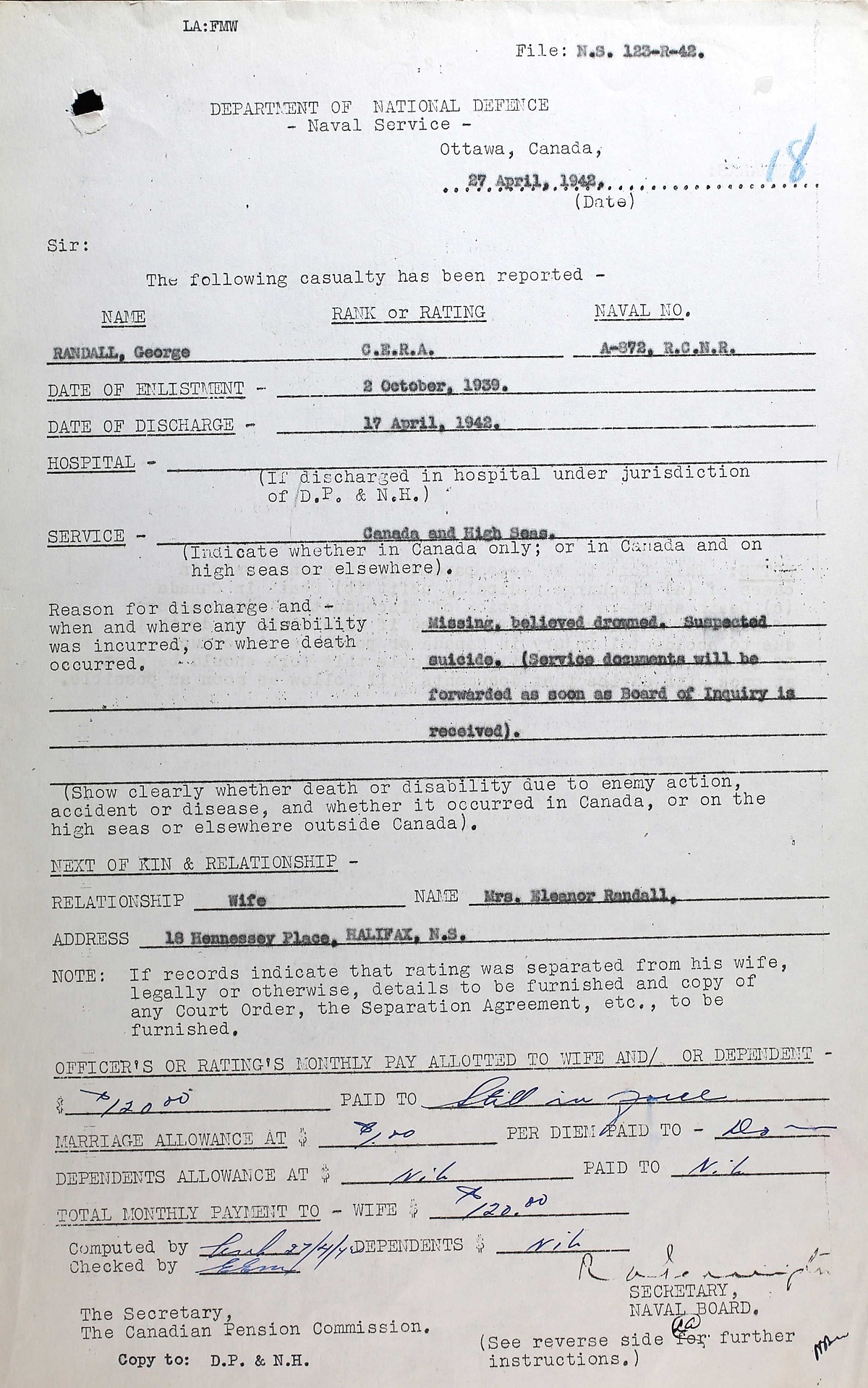 RANDALL, George CERA, A872, RCNR, MPK - 17 Apr 1942, HMCS COBALT - Son of John Harvey and Elizabeth Randall, of North Sydney, NS; husband of Eleanor H. Randall, of Halifax, NS.