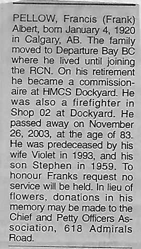 Served in the RCN 29 Apr 1939 - 29 Apr 1961