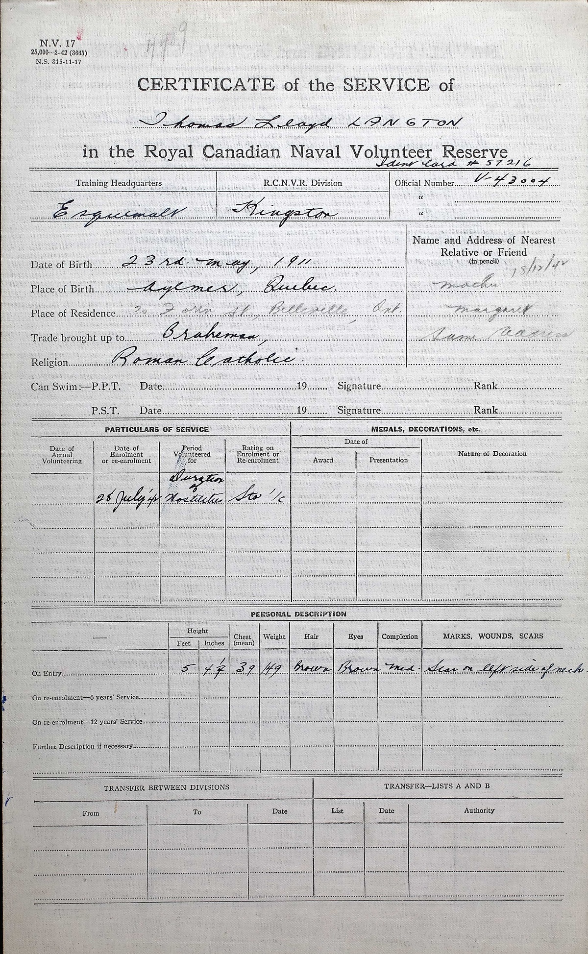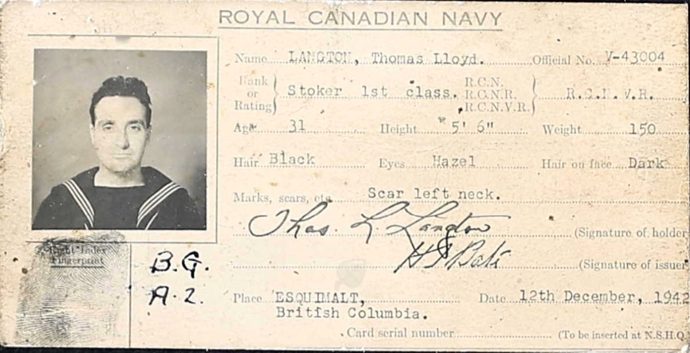 LANGTON, Thomas Lloyd, Stoker, V43004, RCNVR, Died - 11 Jun 1944, HMCS GIFFARD - Son of Thomas E. Langton, and of Margaret Langton, of Belleville, ON.