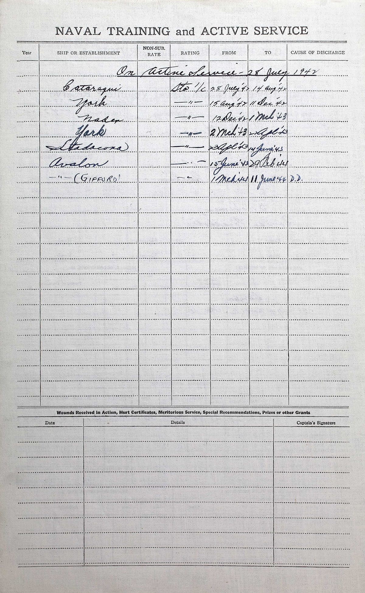 Ships served in: HMCS CATARAQUI - Enlisted 23 Jul 1942. Commenced Active Service 28 Jul 1942 HMCS YORK - Served in YORK 15 Aug 1942 - 11 Dec 1942 as a Sto 1c, RCNVR HMCS GIFFARD - Drafted to GIFFARD 01 Mar 1944 as a Sto 1c, RCNVR