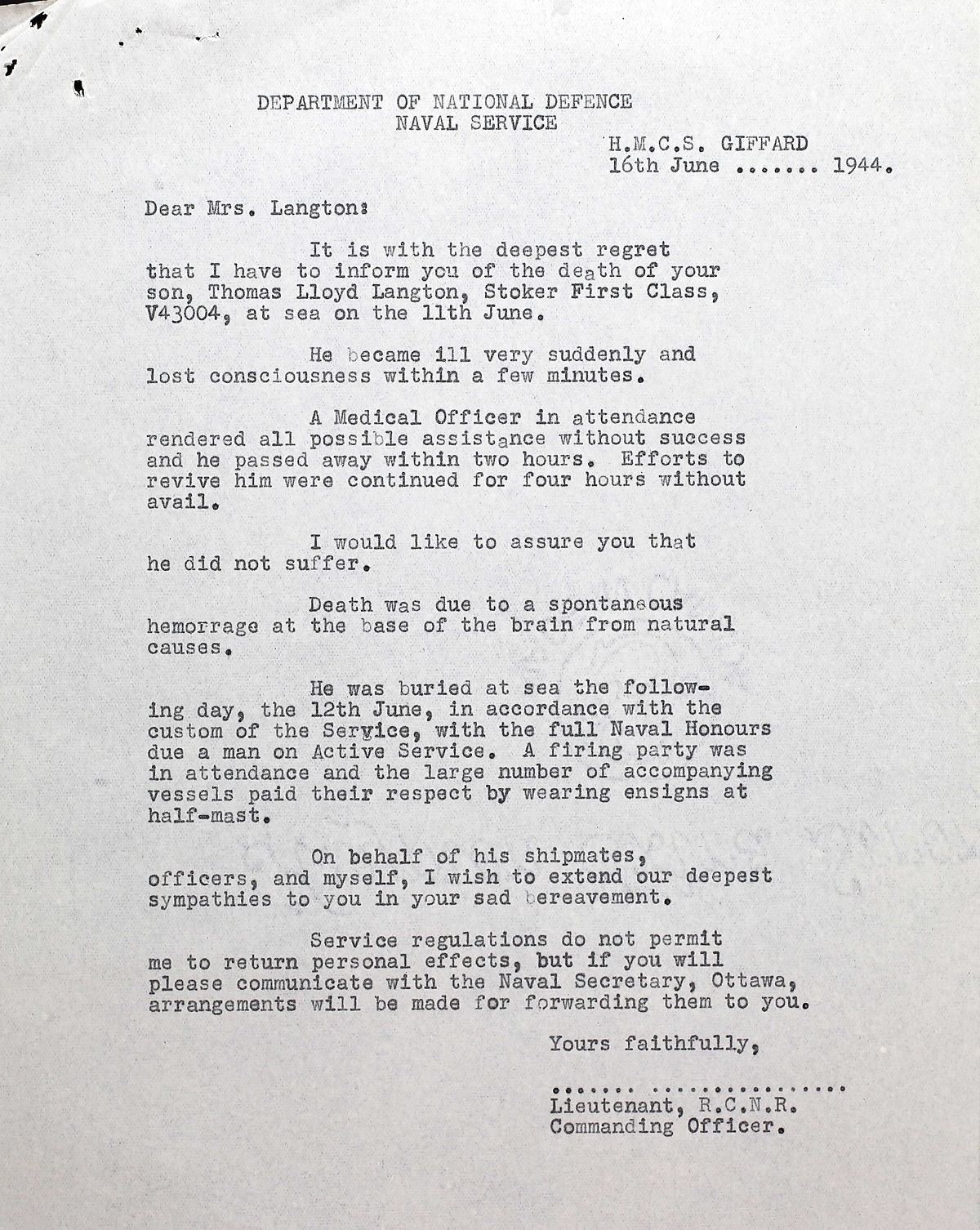 Stoker Thomas Langton died when he was stricken with a brain hemorrhage at sea and passed away with an hour.