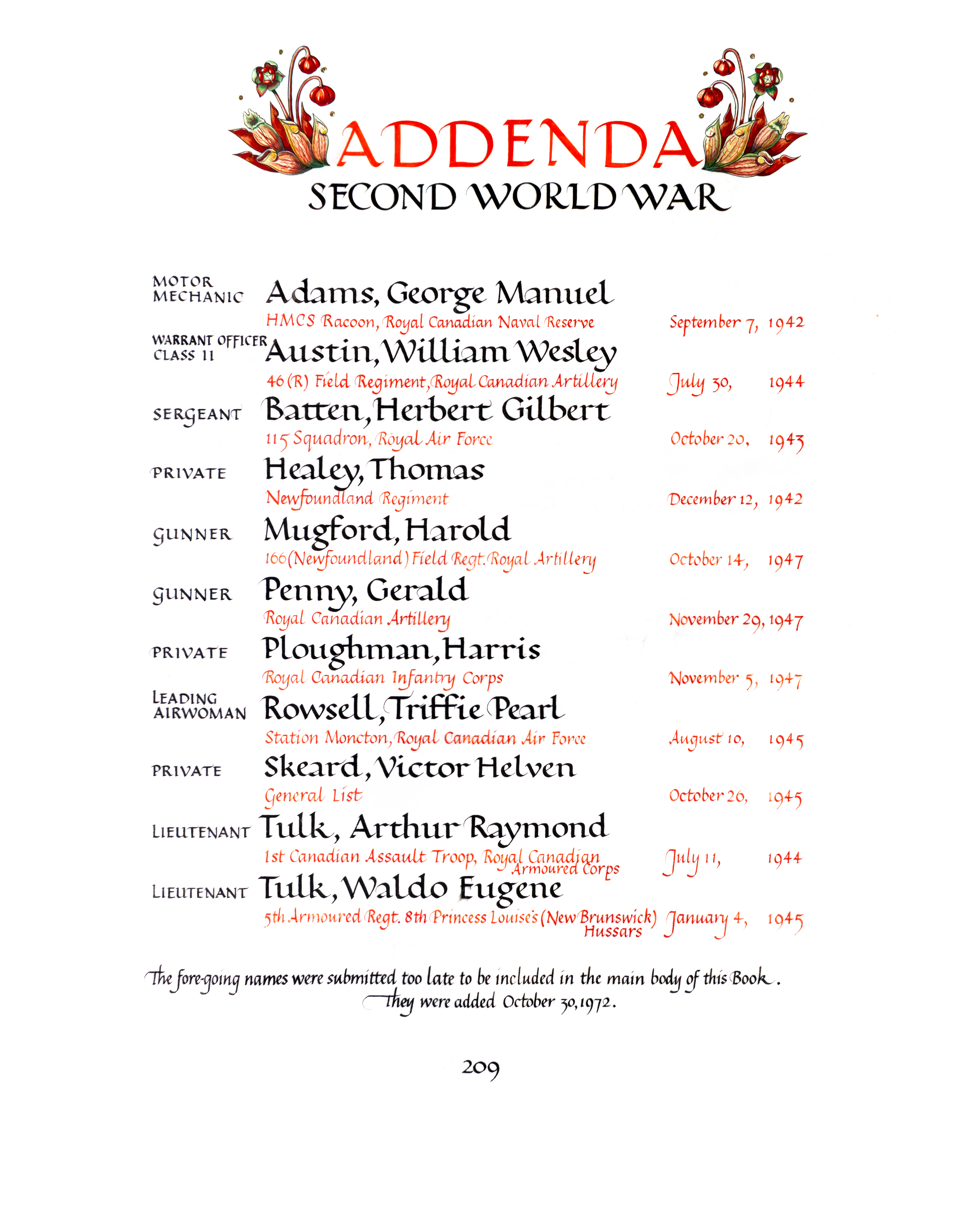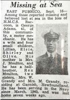 ADAMS, George Manuel, MM, A1441, RCNR, MPK - 07 Sep 1942, HMCS RACCOON - Son of Mr. and Mrs. James Moulton, of Fortune Bay, Newfoundland; husband of Susanna Adams, of East Pubnico, Nova Scotia.