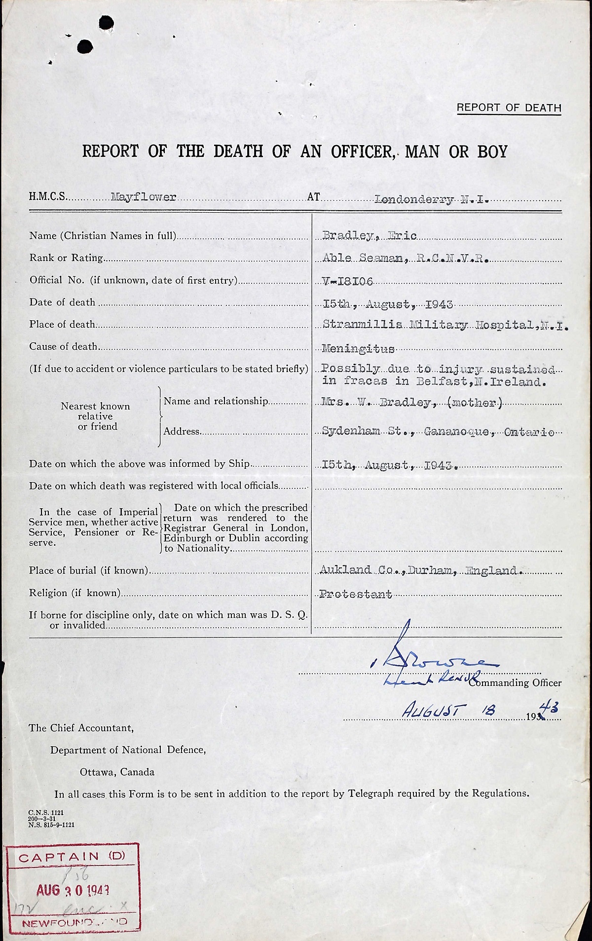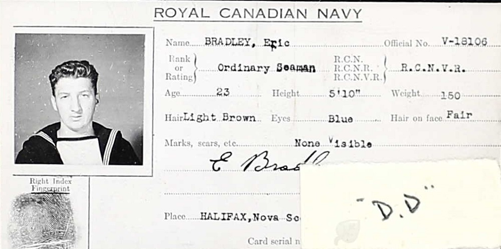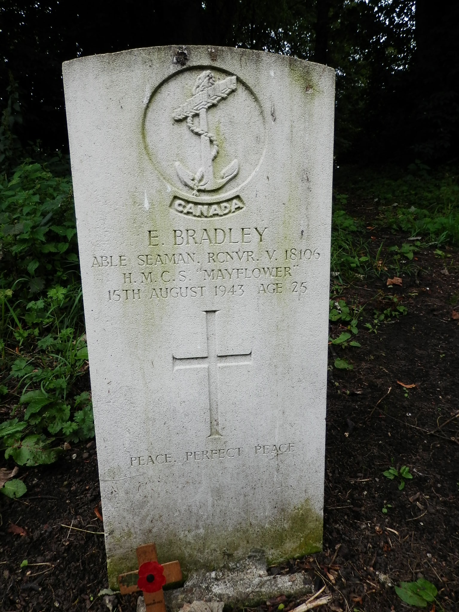 Eric Bradley was born in Durham, England, 22 Jul 1918, and before the war worked as clerk. He enlisted 23 Aug 1940 at age 22 and served in the RCN. After training he was drafted to HMCS Mayflower. He died of meningitis brought on by a head injury received in a fight ashore in Belfast just after his ship had escorted a convoy to Northern Ireland. He is buried in the St. Andrew Churchard, Bishop Auckland, County Durham, England.