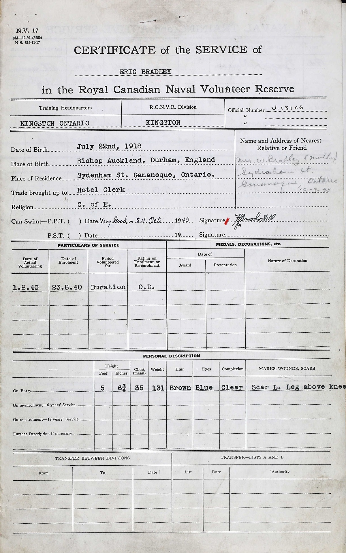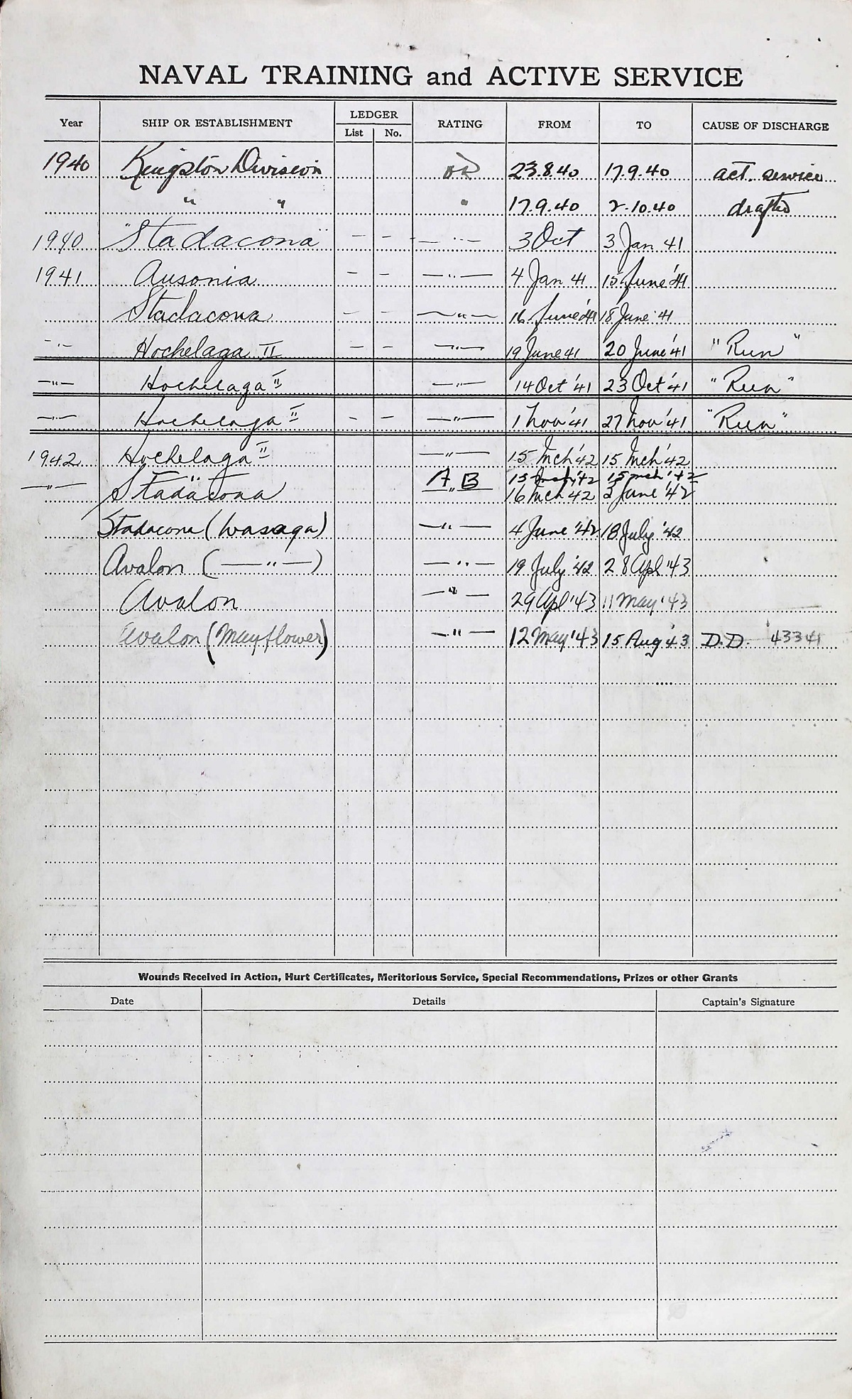Ships served in: KINGSTON DIVISION RCNVR - Enlisted 23 Aug 1940. Commenced Active Service 17 Sep 1940 HMS AUSONIA (Royal Navy Armed Merchant Cruiser) - Served in AUSONIA 04 Jan 1941 - 15 Jun 1941 HMCS WASAGA - Served in WASAGA 04 Jun 1942 - 28 Apr 1943 as an AB, RCNVR HMCS MAYFLOWER - Drafted to MAYFLOWER 12 May 1943 as an AB, RCNVR