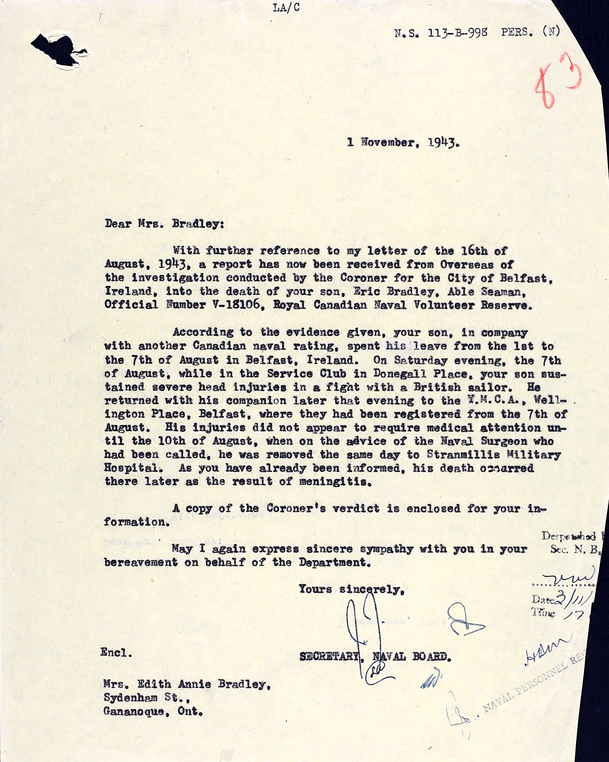 BRADLEY, Eric, AB, V18106, RCNVR, Died - 15 Aug 1943, Age 25, HMCS MAYFLOWER - Son of William and Edith A. Bradley, of Gananoque, ON.