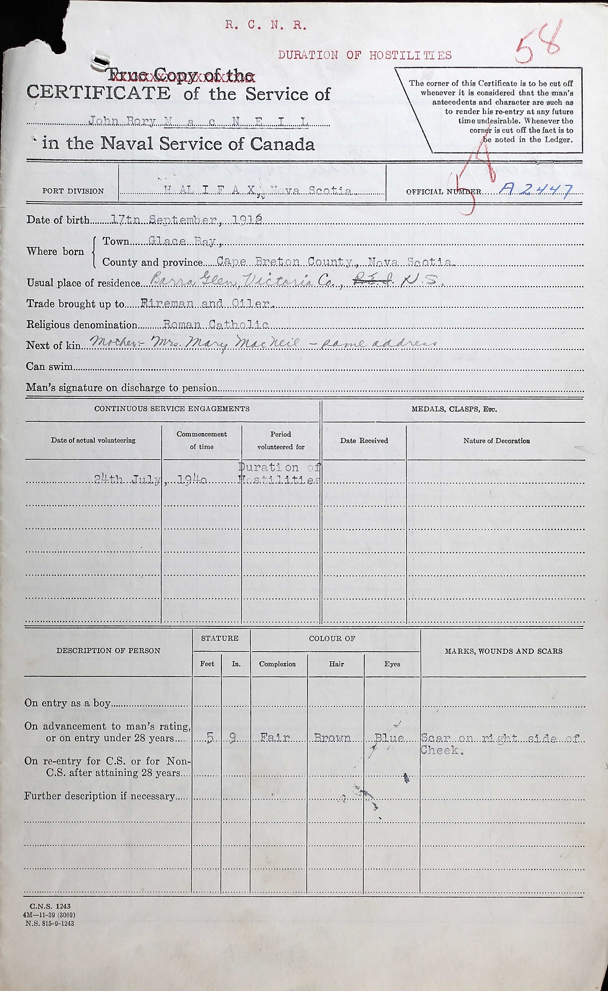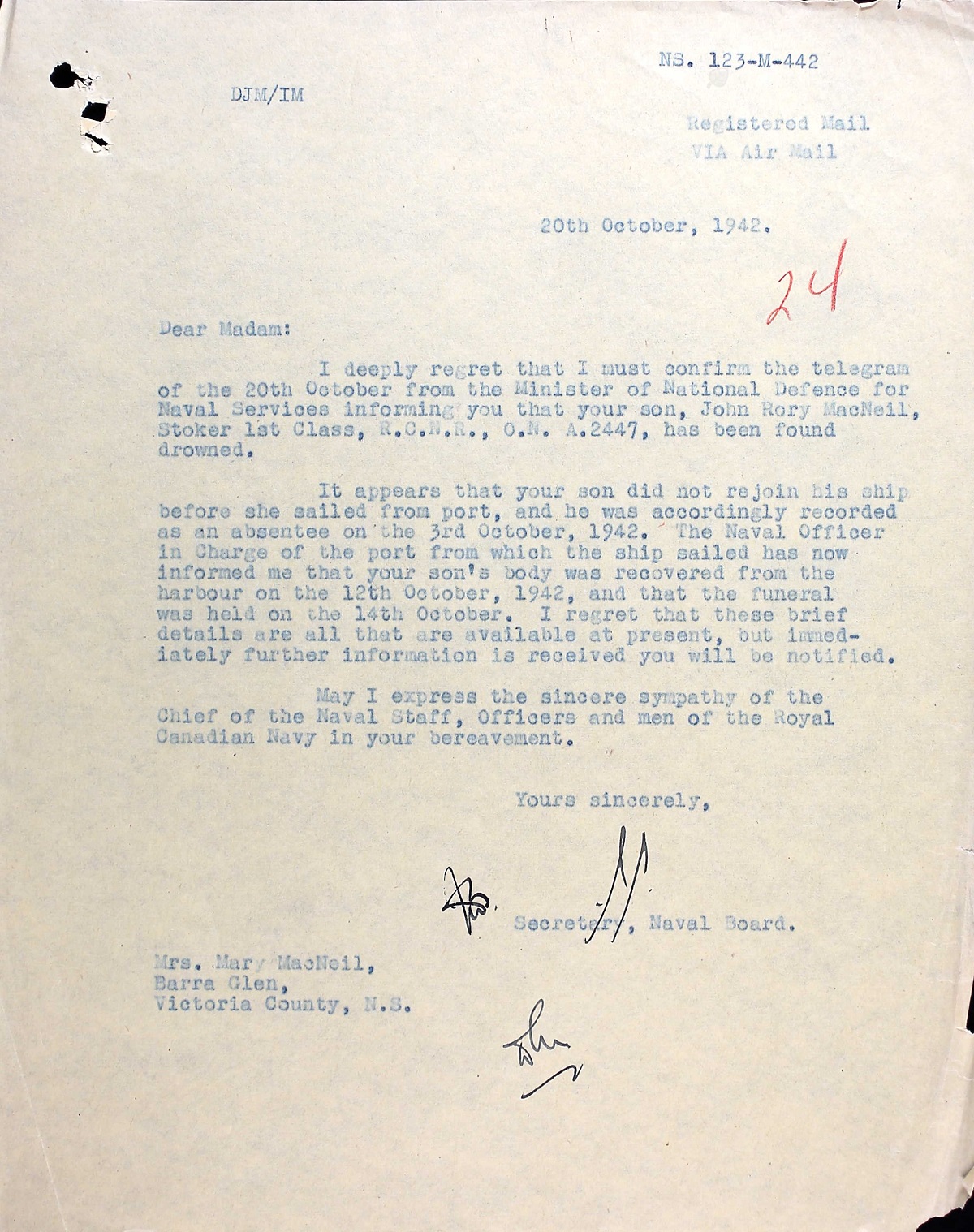 MacNEIL, John Rory, Stoker 1c, A2447, RCNR, died - 01 Oct 1942, HMCS MAYFLOWER - Son of John A. J. and Mary MacNeil, of Barra Glen, Victoria Co., NS.
