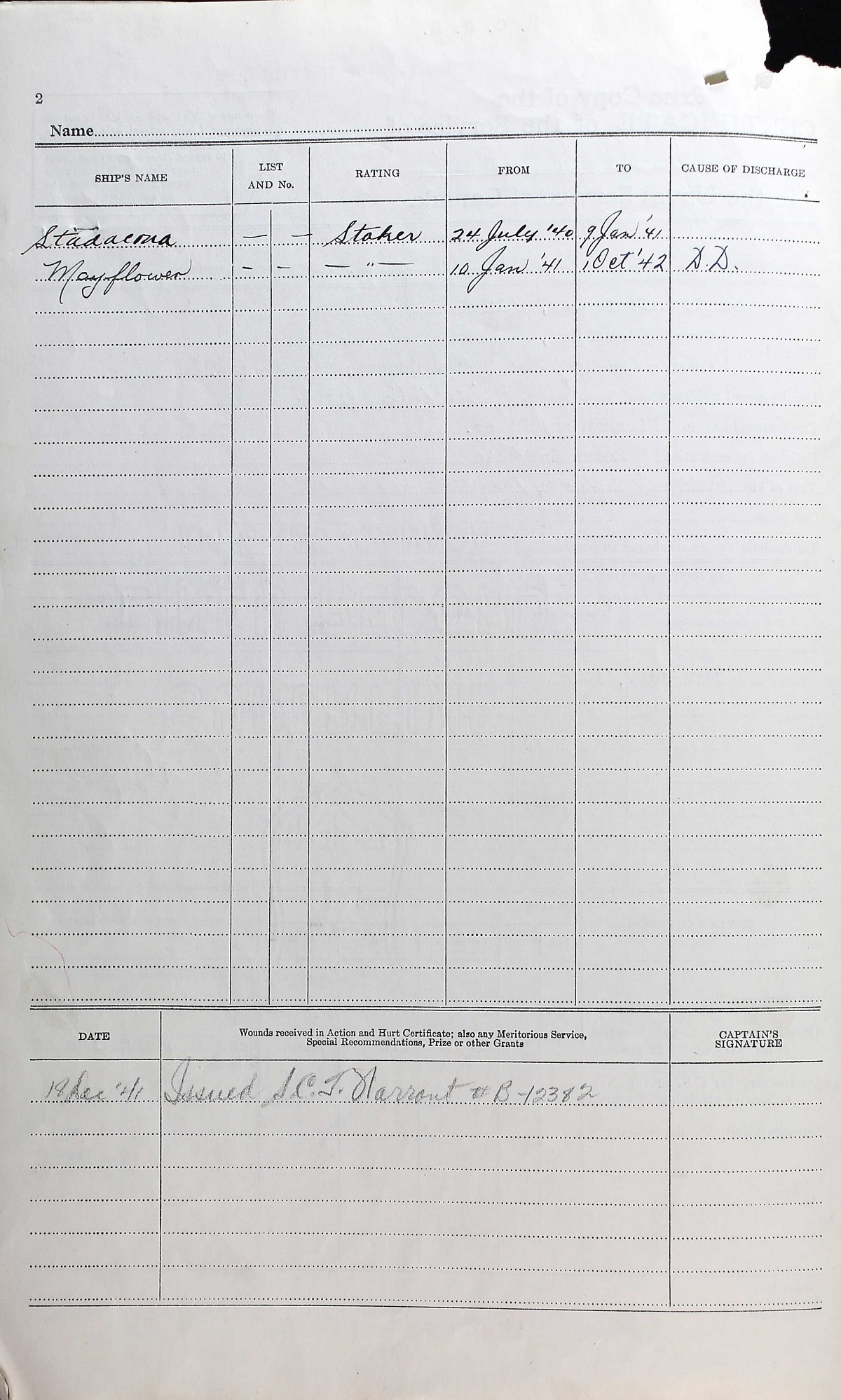 Ships served in: HMCS STADACONA - Enlisted 24 Jul 1940 HMCS MAYFLOWER - Drafted to MAYFLOWER 14 Jan 1941 as a Stoker 1st Class, RCNR