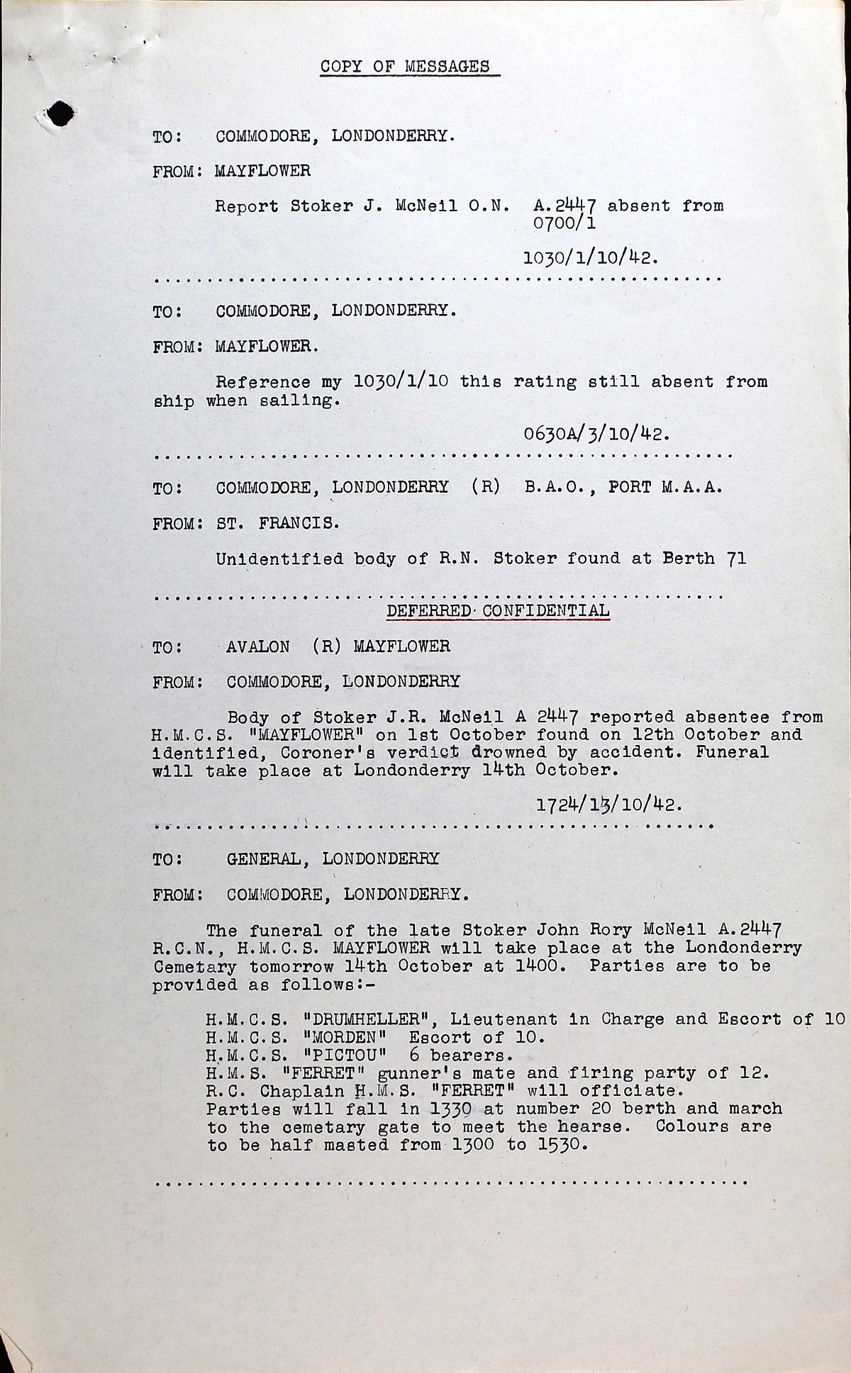 Stoker 1st Class J. R. MacNeil was found drowned in Londonderry, Ireland harbour. Stoker MacNeil failed to rejoin his ship HMCS MAYFLOWER after shore leave. He was reported absent after his ship left port. His body was recovered from the harbour on October 12, 1942. His date of death is presumed to be 01 Oct 1942, the day he failed to return from leave. Stoker MacNeil is buried in the Londonderry City Cemetery, Londonderry, Northern Ireland