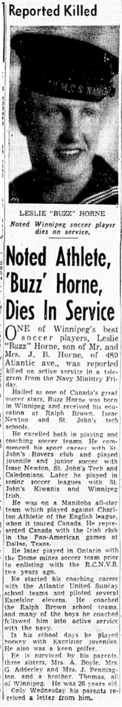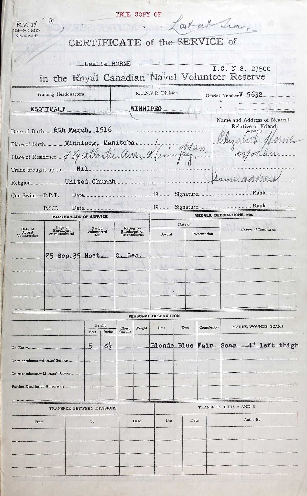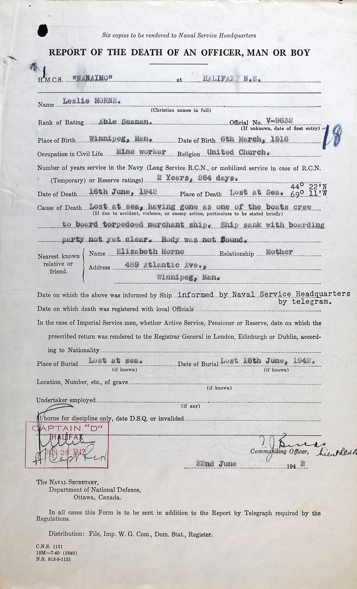 HORNE, Leslie, AB, V9632, RCNVR, MPK - 16 Jun 1942, HMCS NANAIMO - Son of Joseph Benn and Elizabeth Mary Horne, of Winnipeg, MB.