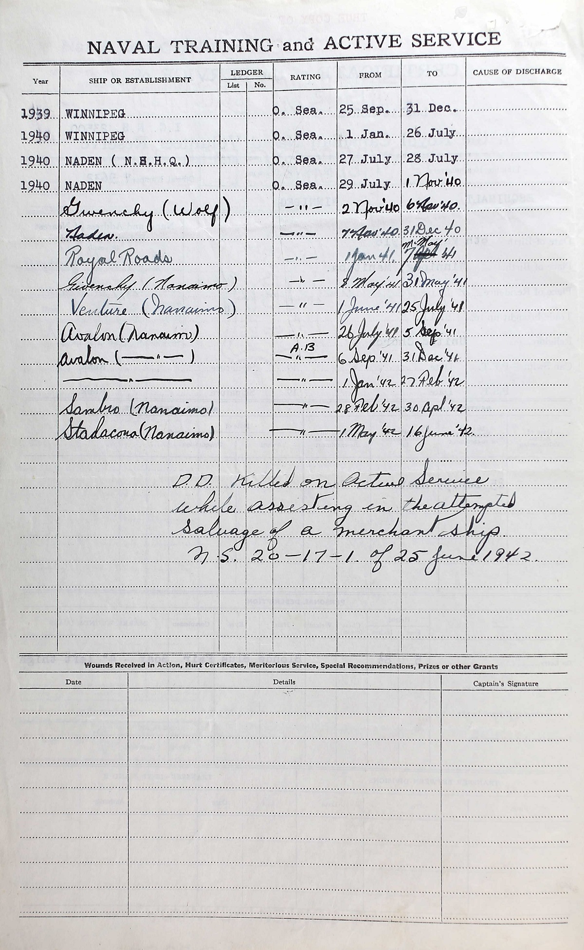 Ships served in: RCNVR DIVISION WINNIPEG - Enlisted 25 Sep 1939 HMCS WOLF - Served in WOLF 02 Nov 1940 - 06 Nov 1940 as an OS, RCNVR while in training at HMCS NADEN HMCS NANAIMO - Drafted to NANAIMO 08 May 1941 as an OS, RCNVR. Rated A/AB 06 Sep 1941