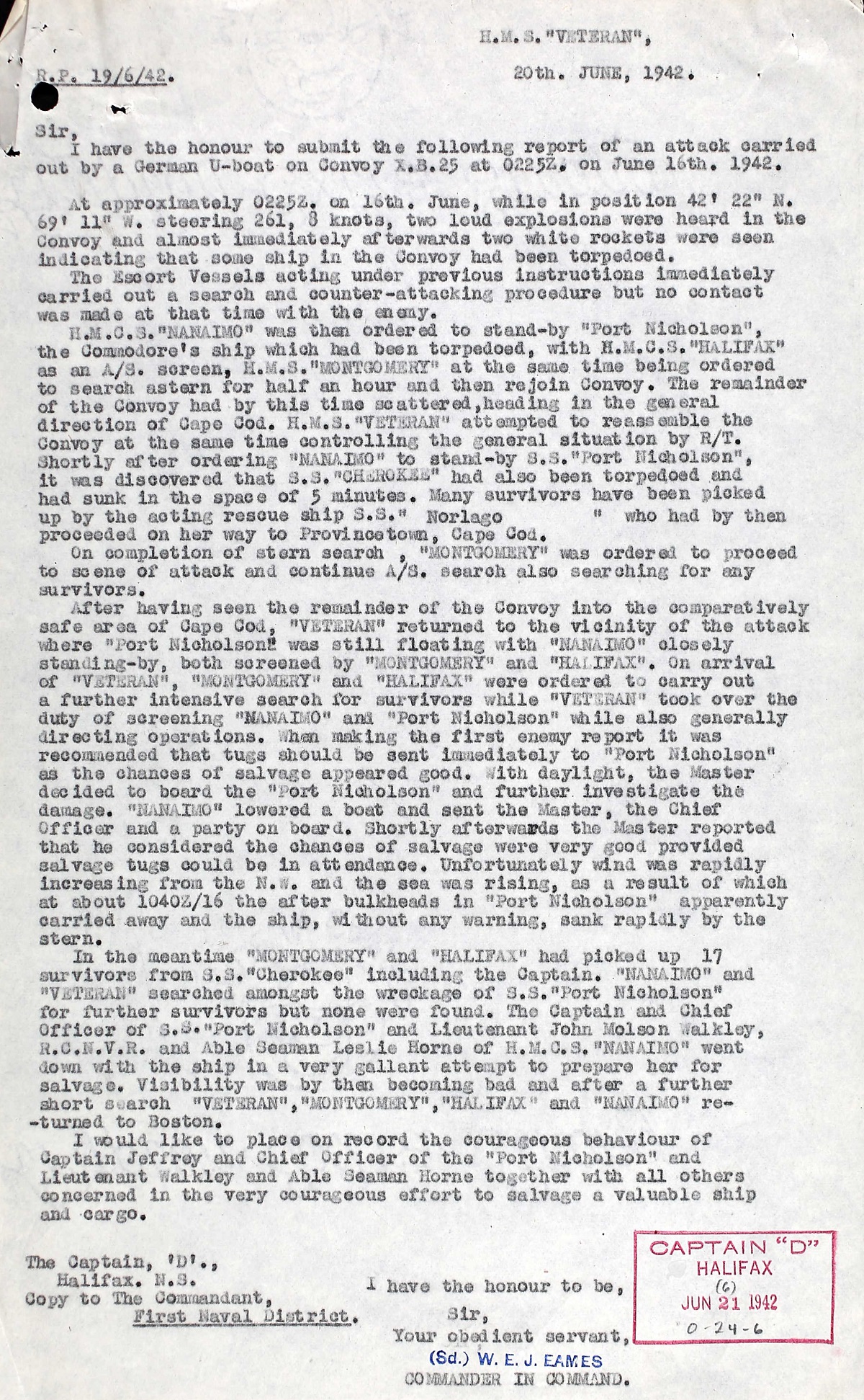The sinking of the Port Nicholson - The Port Nicholson formed part of convoy XB 25, one of the coastal convoy routes between Halifax Harbour and Boston. She was under the command of her master, Harold Charles Jeffrey, and was carrying a cargo of 1,600 tons of automobile parts and 4,000 tons of military stores. The convoy was tracked by the German submarine U-87, commanded by Joachim Berger. At 4.17 hours on the morning of 16 June 1942 he fired a torpedo at the convoy, which was then 100 miles (160 km) off Portland, Maine. He fired a second torpedo a minute later, but the gale conditions at the time prevented him from observing the results accurately, and he recorded that while one torpedo had hit a ship, the other seemed to have missed. In fact, both torpedoes struck the Port Nicholson, the first in the engine room, the second in the stern. Two men in the engine room were killed immediately, and as the Port Nicholson began to settle by the stern, the remaining crew abandoned ship and were picked up by the Royal Canadian Navy corvette HMCS NANAIMO. The Port Nicholson did not sink immediately, and by dawn was still afloat. Her master returned to the ship, accompanied by the chief engineer, and Lieutenant John Molson Walkley and three ratings from NANAIMO, to see if the ship could be salvaged. While they were aboard, worsening weather caused the ship to suddenly start to sink. The party abandoned her, but their boat was overturned in the suction as Port Nicholson went down, drowning Jeffrey, Walkley, the chief engineer and a rating. The two surviving ratings were rescued by NANAIMO, which landed the survivors from Port Nicholson at Boston.