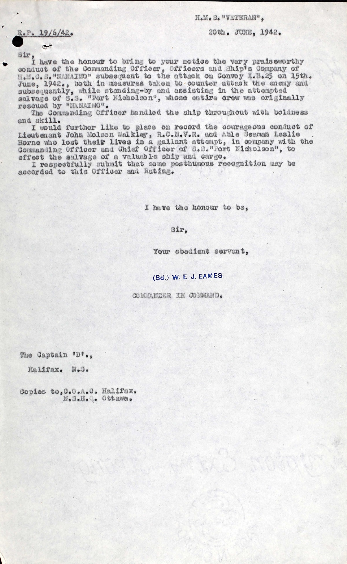 (LH06) Report from the C.O. of HMS VETERAN on the sinking of the Port Nicholson (LH07) Recommendation for posthumous recognition for Lt John Walkley and AB Leslie Horne by the C.O. of HMS VETERAN