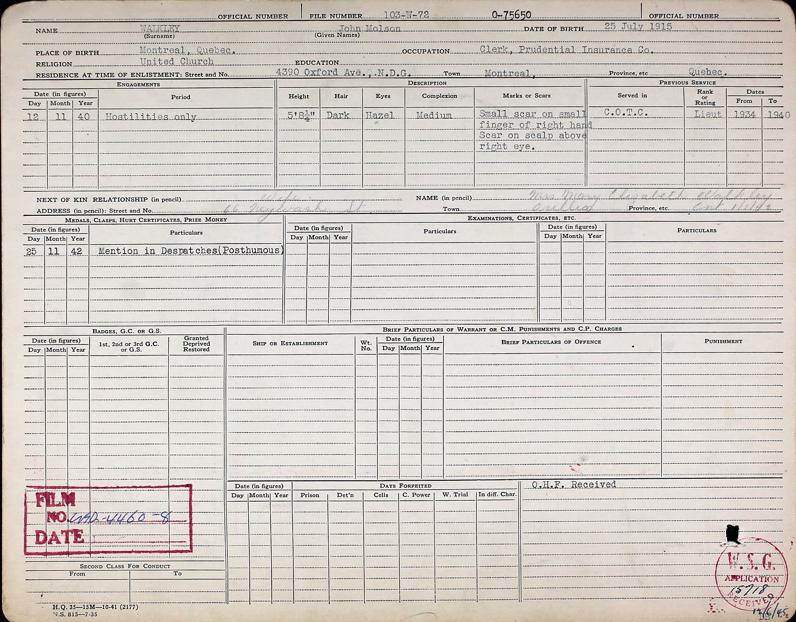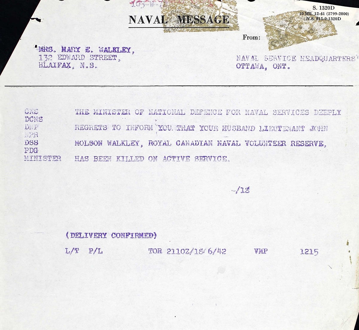 Mentioned in Despatches Citation: WALKLEY, John Molson, Lieutenant, Posthumous Mention in Despatches, RCNVR, HMCS NANAIMO - Awarded as per Canada Gazette of 28 November 1942 and London Gazette of 22 December 1942. "For gallantry and supreme devotion to duty in connection with convoys."