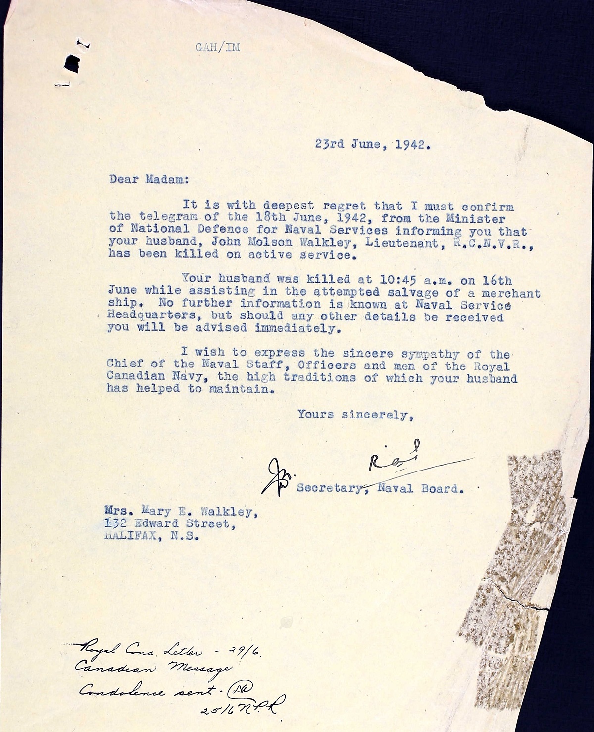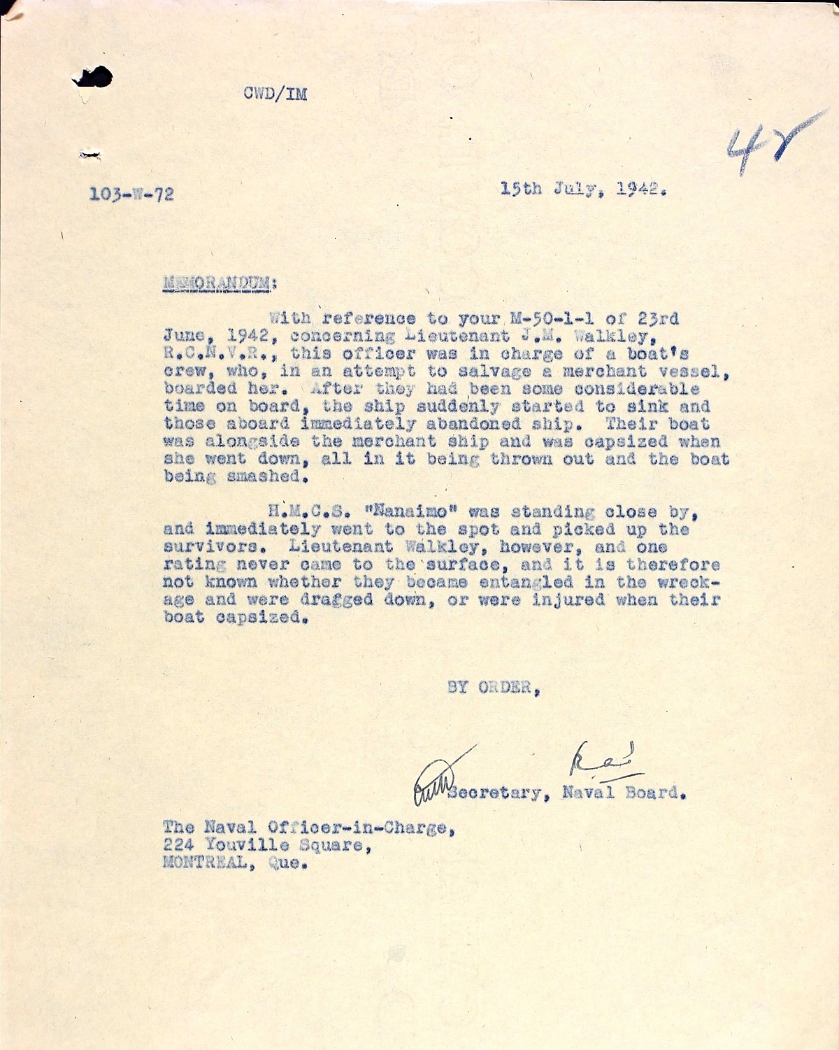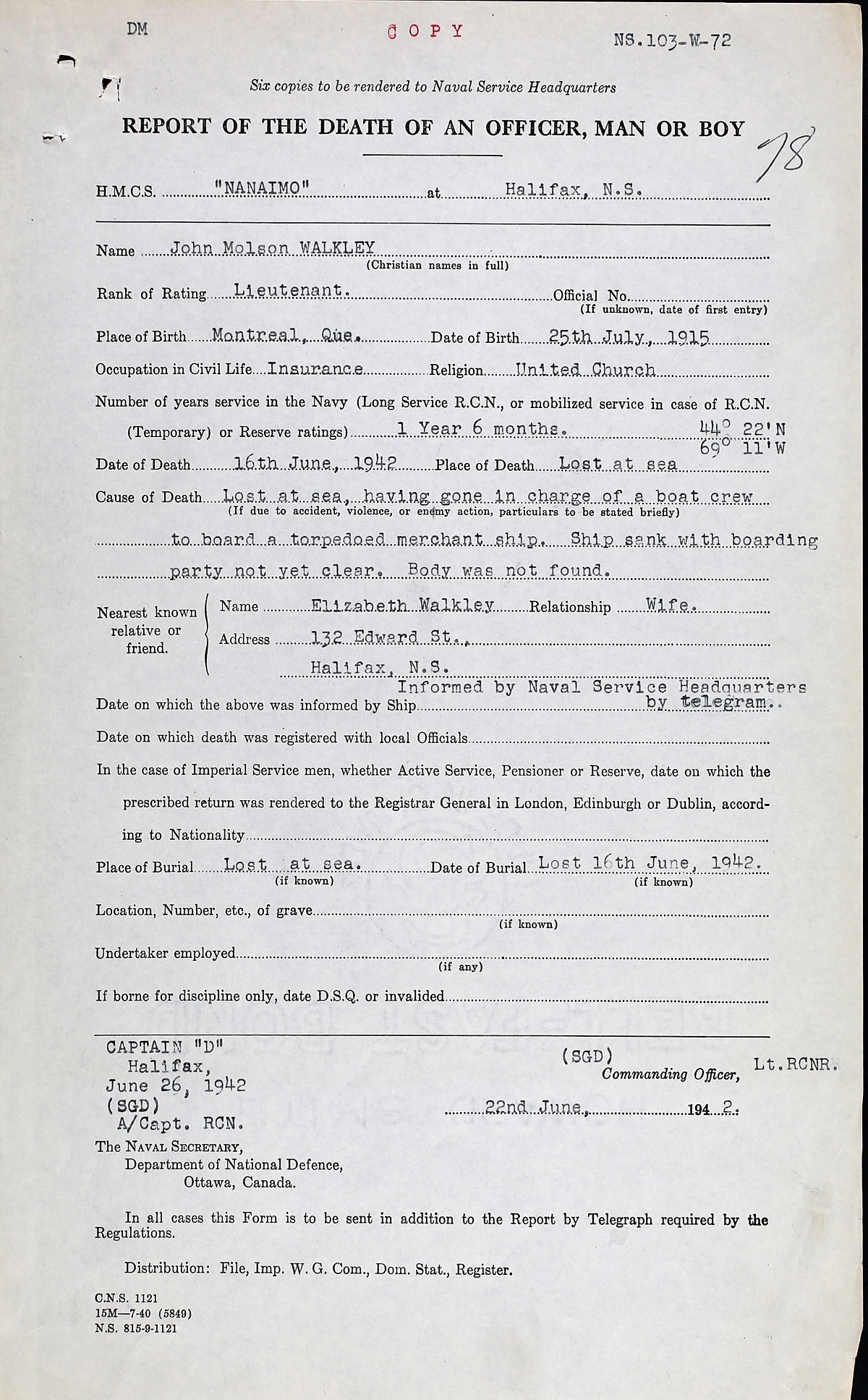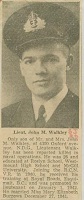 WALKLEY, John Molson, Lt, RCNVR, MPK - 16 Jun 1942, HMCS NANAIMO - Son of John Molson and Emily Walkley, of Montreal, QC; husband of Mary Elizabeth Walkley, of Halifax, NS.