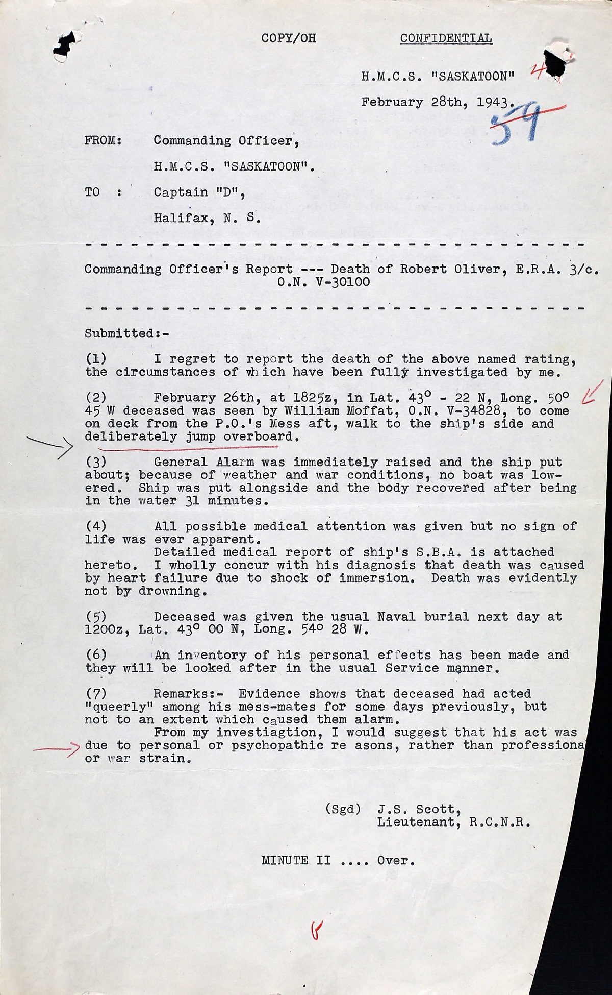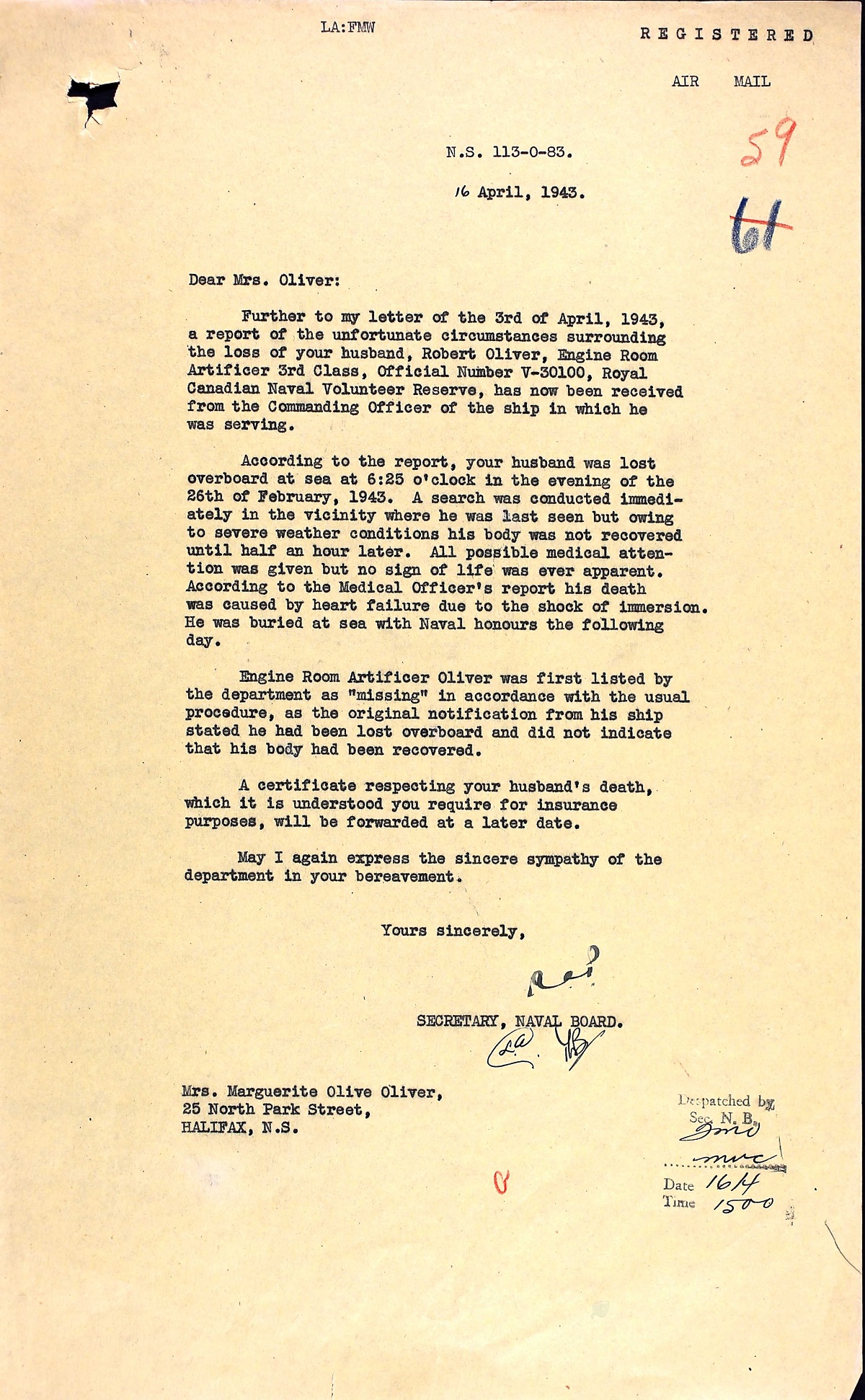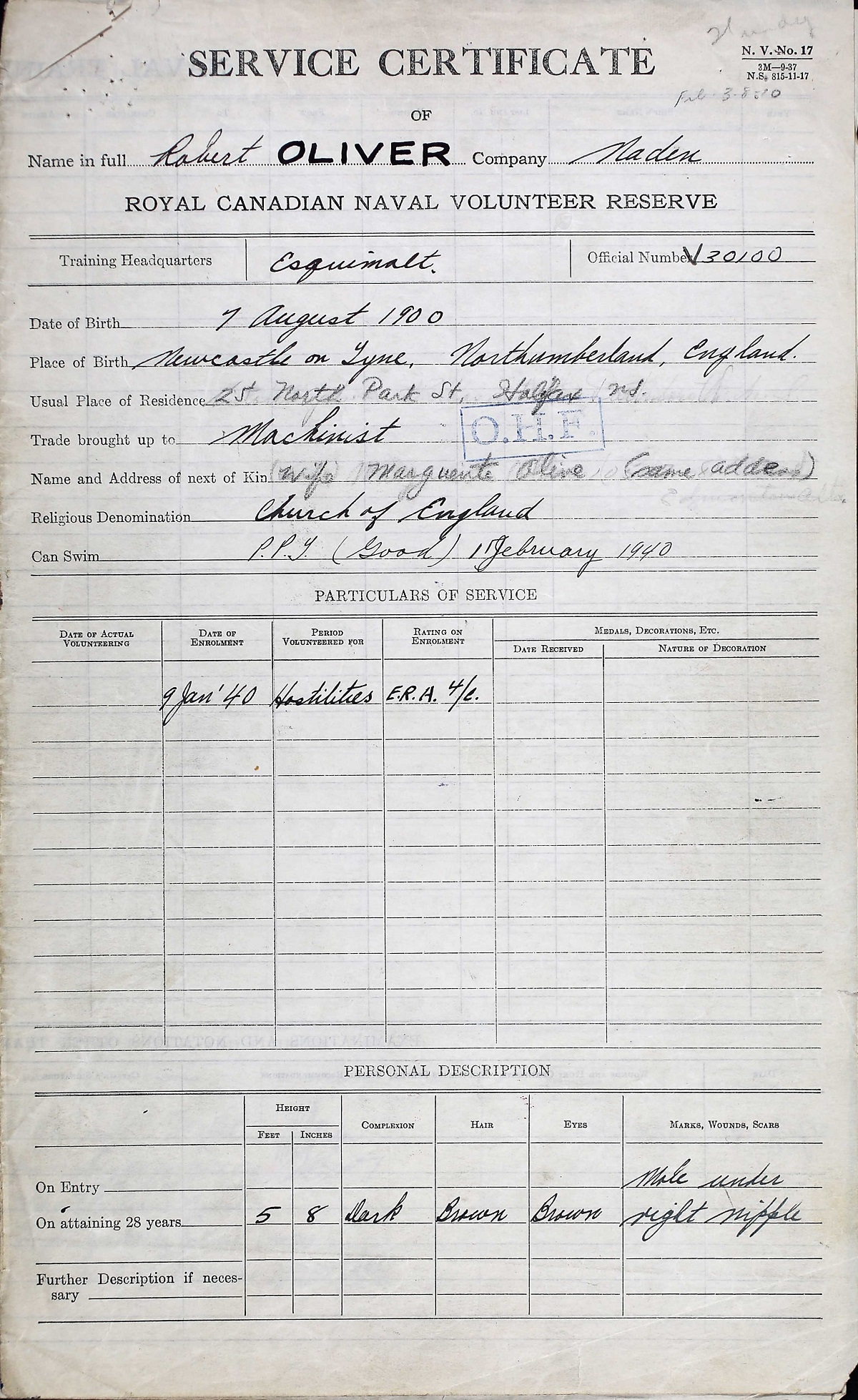 OLIVER, Robert, ERA 3c, V30100, RCNVR, killed - 26 Feb 1943, HMCS SASKATOON - Son of Edward Oliver, and of Mary Oliver, of London; husband of Marguerite Olive Oliver, of Calgary, AB.