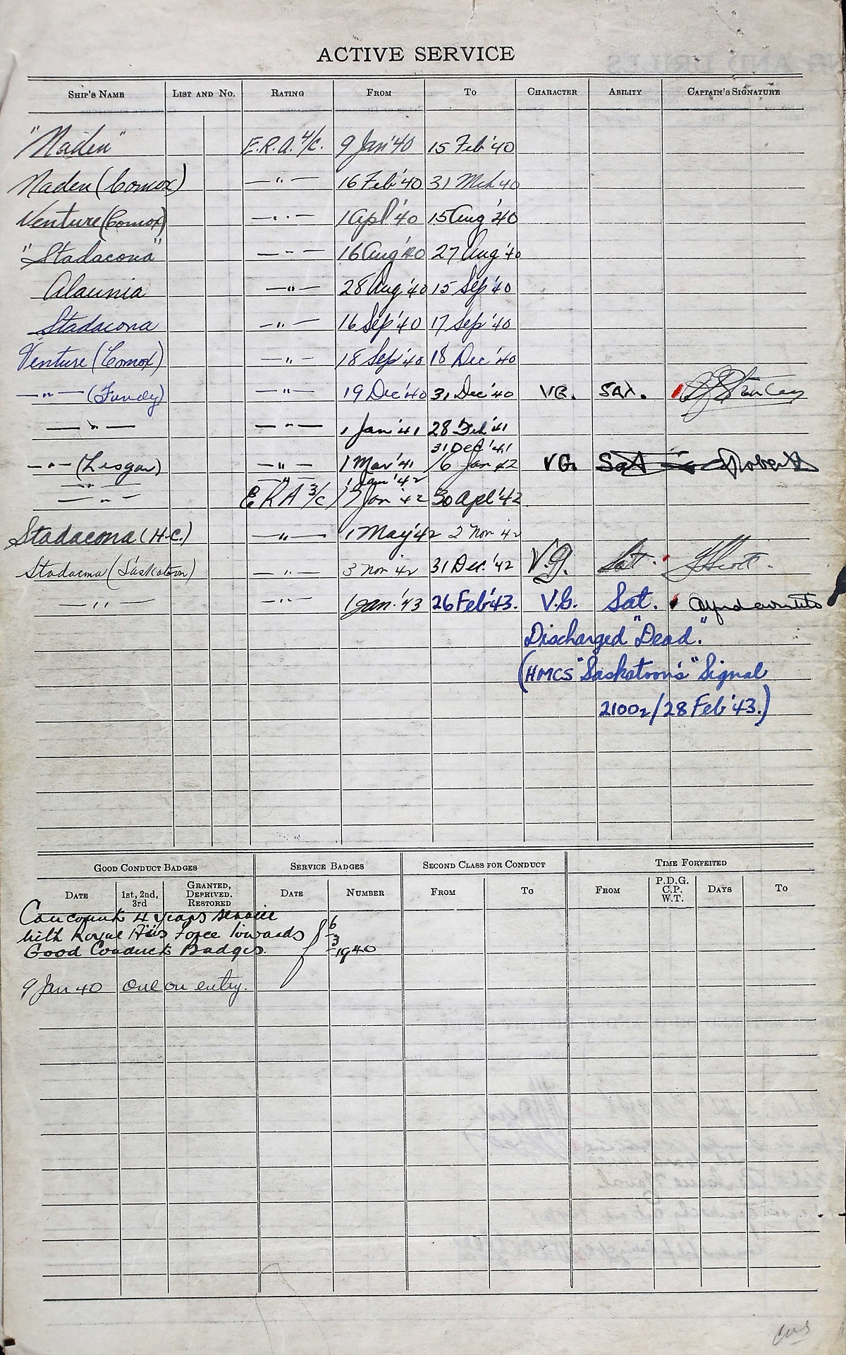Ships served in: HMCS NADEN - Enlisted / Commenced Active Service 09 Jan 1940 as an ERA 4c, RCNVR HMCS COMOX - Served in COMOX 16 Feb 1940 - 15 Aug 1940 as an ERA 4c, RCNVR HMS ALAUNIA (Armed Merchant Cruiser) - Served in ALAUNIA 28 Aug 1940 - 15 Sep 1940 as an ERA 4c, RCNVR HMCS COMOX - Served in COMOX 18 Sep 1940 - 18 Dec 1940 as an ERA 4c, RCNVR HMCS FUNDY - Served in FUNDY 19 Dec 1940 - 28 Feb 1941 as an ERA 4c, RCNVR HMCS LISGAR - Served in LISGAR 01 Mar 1941 - 30 Apr 1942 as an ERA 4c and ERA 3c, RCNVR. Rated ERA 3c 31 Dec 1941 HMCS STADACONA - (STADACONA for) unknown Harbour Craft - 01 May 1942 - 02 Nov 1942 as an ERA 3c HMCS SASKATOON - Drafted to SASKATOON 03 Nov 1942 as an ERA 3c