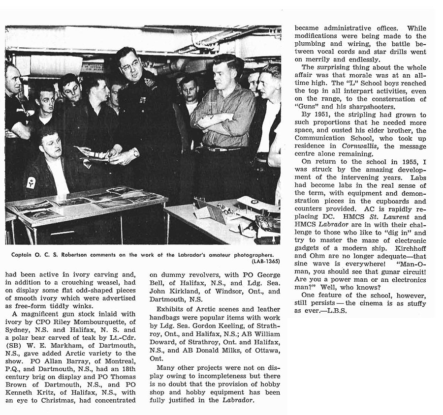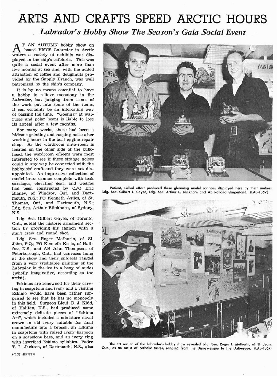 Below - Article from the March 1956 edition of the Crowsnest magazine on a hobby show held aboard HMCS LABRADOR. LS.EM Arthur Lawrence Blinkhorn is in the first photo