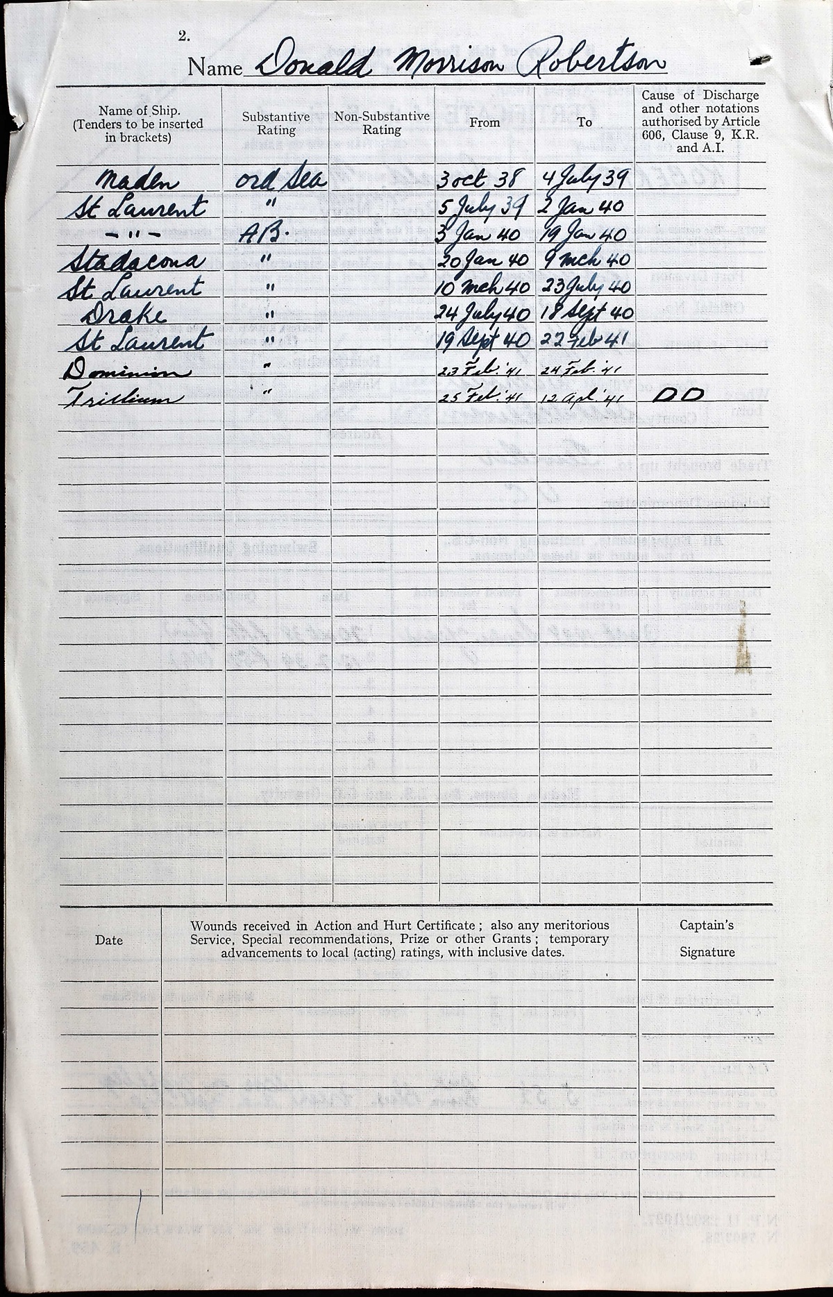 Ships served in: HMCS NADEN - Enlisted 03 Oct 1938 HMCS ST LAURENT - Served in ST LAURENT 05 Jul 1939 - 19 Jan 1940 as an OS and AB, RCN. Rated AB 03 Jan 1940 HMCS ST LAURENT - Served in ST LAURENT 10 Mar 1940 - 23 Jul 1940 as an AB, RCN HMCS ST LAURENT - Served in ST LAURENT - 19 Sep 1940 - 22 Feb 1941 as an AB, RCN HMS TRILLIUM - Drafted to TRILLIUM 25 Feb 1941 as an AB, RCN