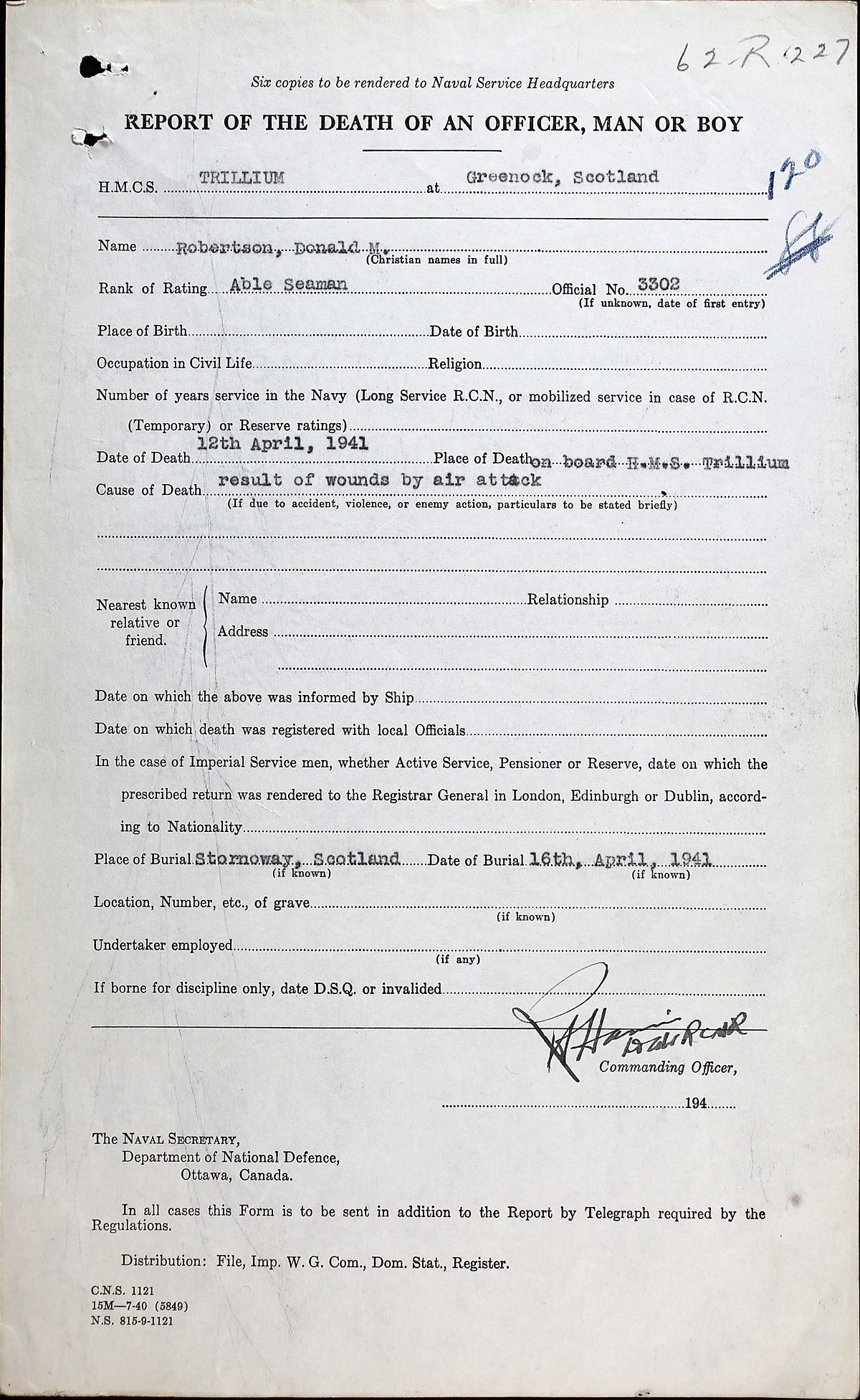 ROBERTSON, Donald Morrison, AB, 3302, RCN, killed - 12 Apr 1941, HMS TRILLIUM - Son of James and Jessie Robertson, of Vancouver, BC.