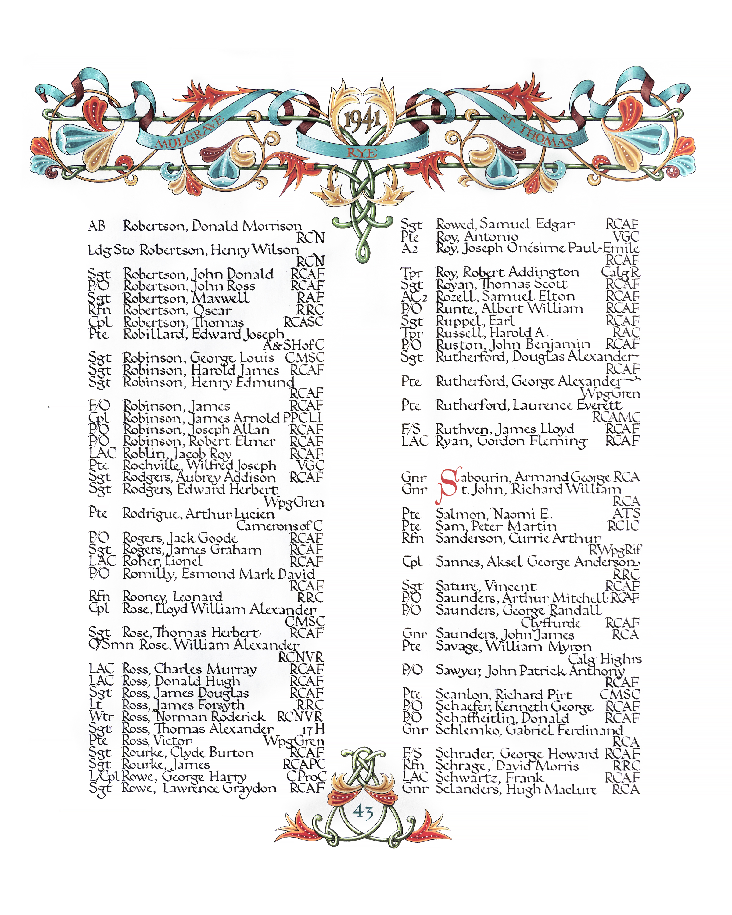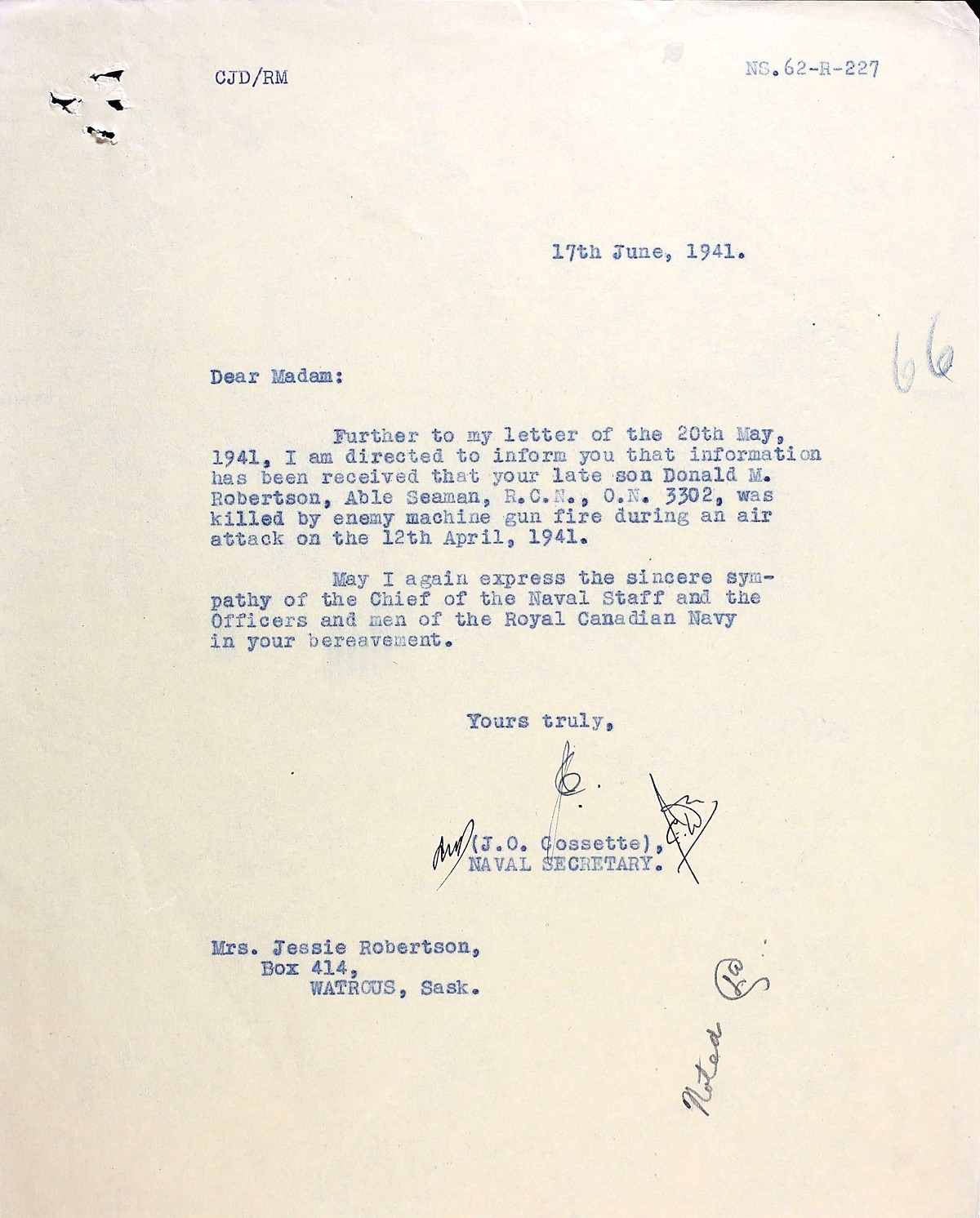 Born 29 Jul 1920 in Watrous and is buried at Sandwick cemetery, Stornoway, on the Isle of Lewis. Robertson's father James served with the King's Own Scottish Borderers during World War I, his uncle was the first Watrous resident killed in that war, and three of his brothers followed him into the services. In an interesting twist, Don Robertson was the first Watrous casualty of the second war. Robertson enlisted at Esquimalt late in 1938 and appeared in the honour guard which welcomed King George VI and Queen Elizabeth to Esquimalt the next year. He served aboard HMCS TRILLIUM and was fatally wounded rescuing a shipmate while the Trillium was under attack by a German fighter off the coast of Scotland. For this he was Mentioned in Despatches. Donald was the son of James, a tailor, and Jessie Robertson who came to Watrous from Scotland in 1910 and later retired to Vancouver.