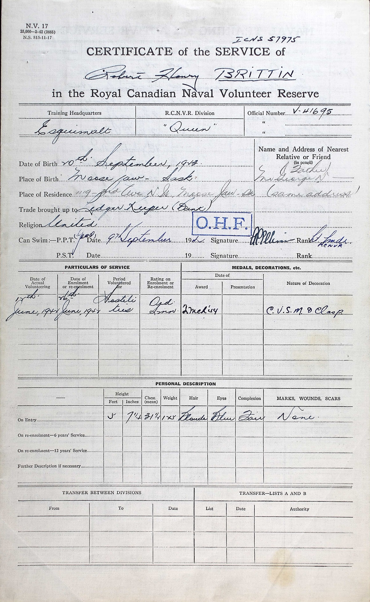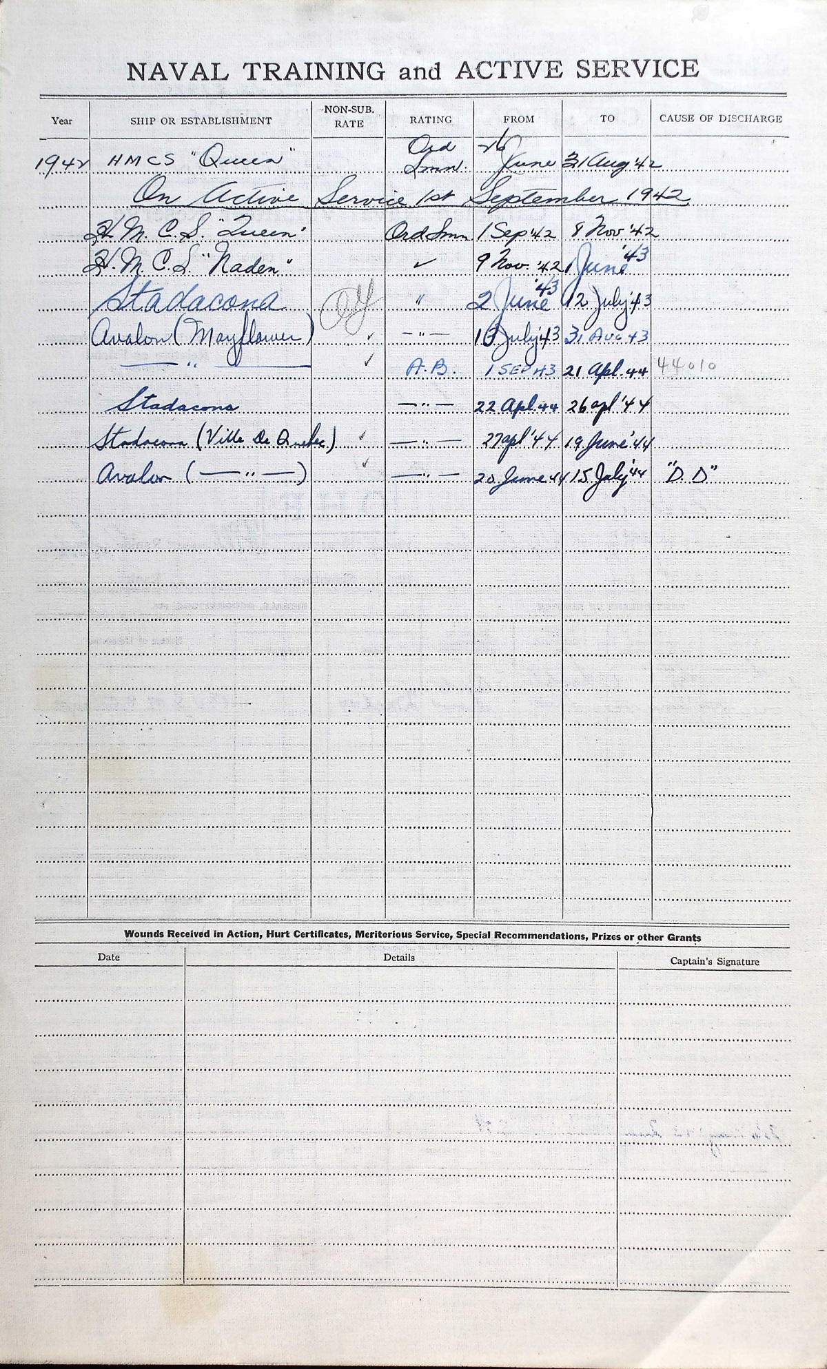 Ships served in: HMCS QUEEN - Enlisted 16 Jun 1942. Commenced Active Service 01 Sep 1942 HMCS MAYFLOWER - Served in MAYFLOWER 13 Jul 1943 - 21 Apr 1944 as an OS and AB, RCNVR. Rated AB 15 Sep 1943. Rated A/Seaman Torpedoman 26 May 1943 HMCS VILLE DE QUEBEC - Drafted to VILLE DE QUEBEC27 Apr 1944 as an AB, RCNVR