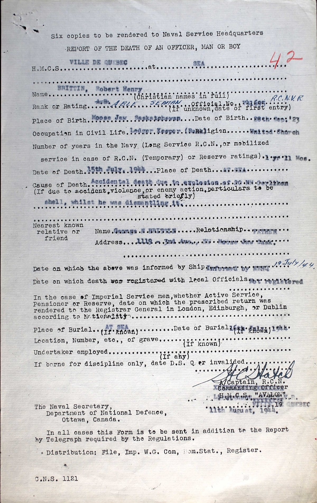 Information: Able Seaman Robert Henry Brittin was killed when a round of Oerlikon ammunition exploded while he was dismantling it in an attempt to make a souvenir. He was buried at sea.