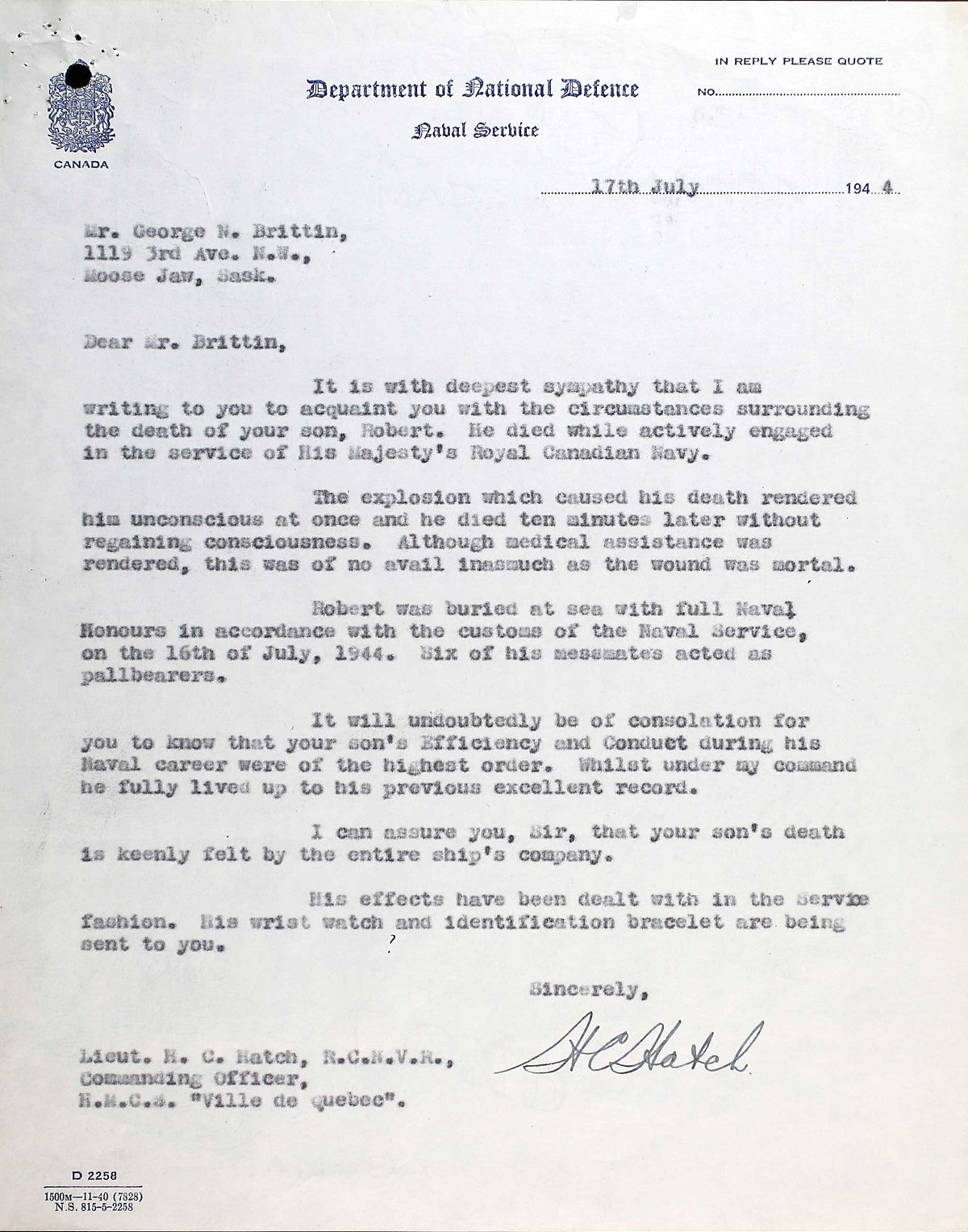 BRITTIN, Robert Henry, AB, V41695, RCNVR, died - 15 Jul 1944, HMCS VILLE DE QUEBEC - Son of George Norman and Winnifred (née Merner) Brittin, Moose Jaw, Sk.