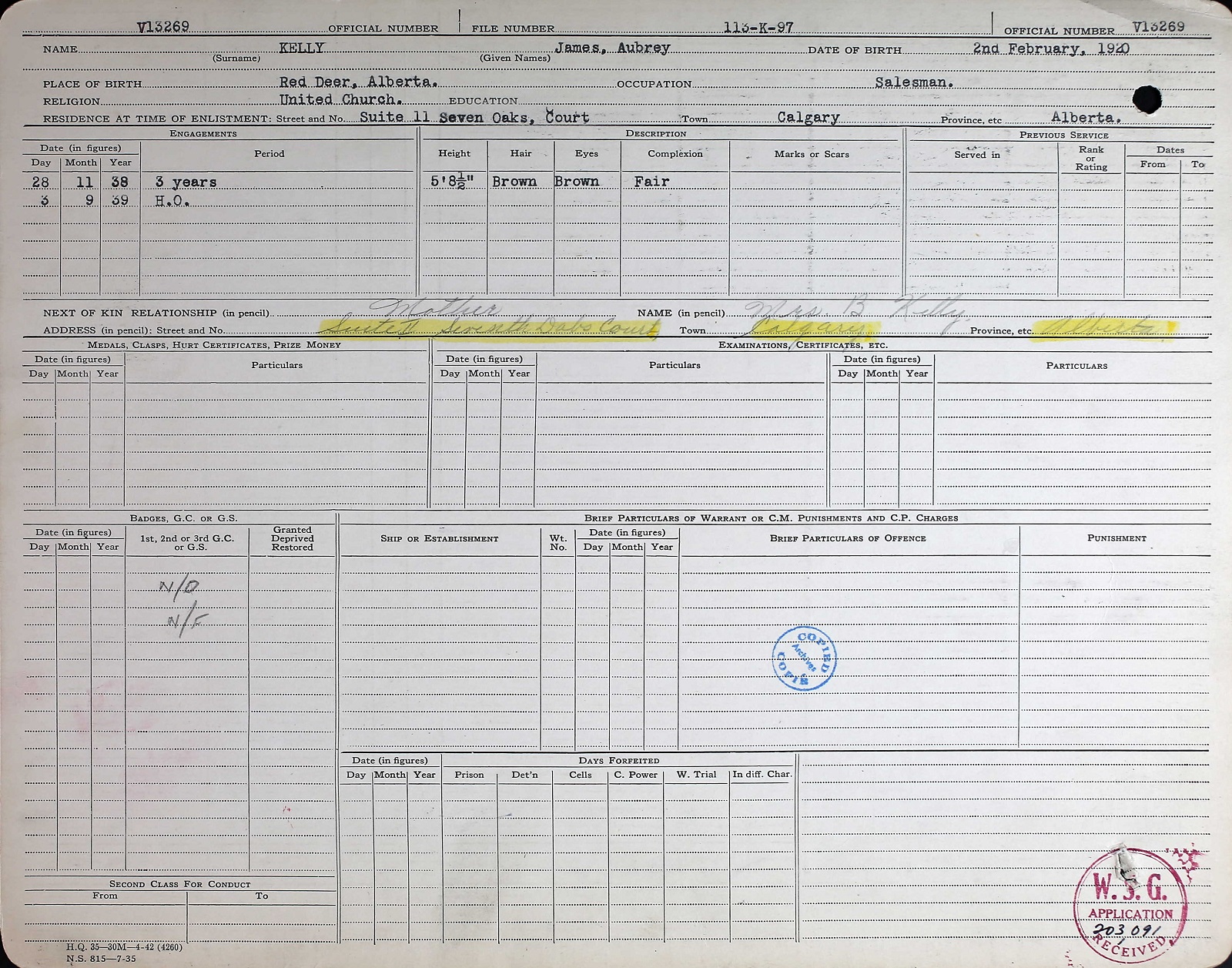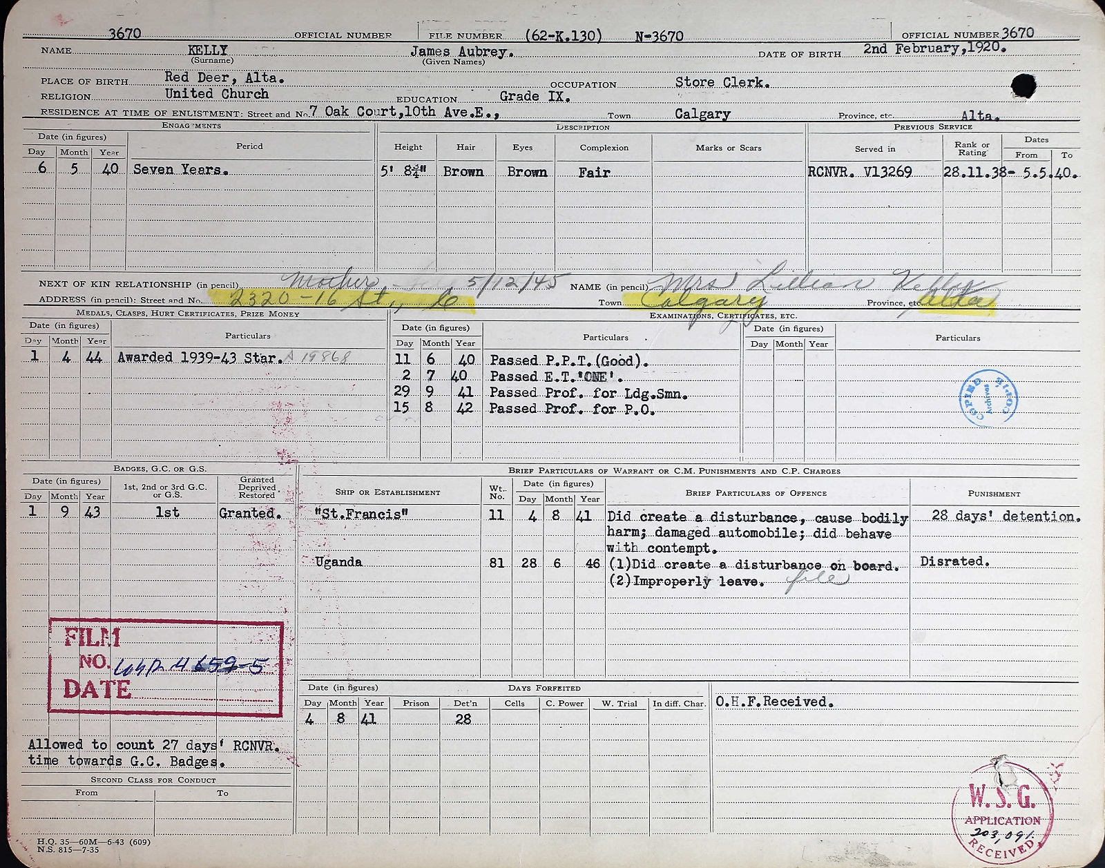 KELLY, James Aubrey, LS, 3670, RCN, MPK - 04 Nov 1946, HMCS CRESCENT - Son of William James Kelly and Lillian O. Kelly, of Calgary, AB.