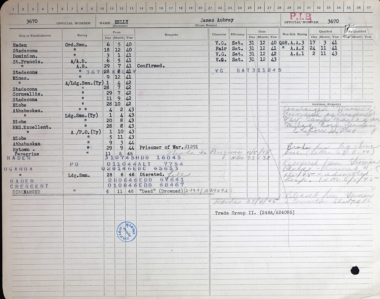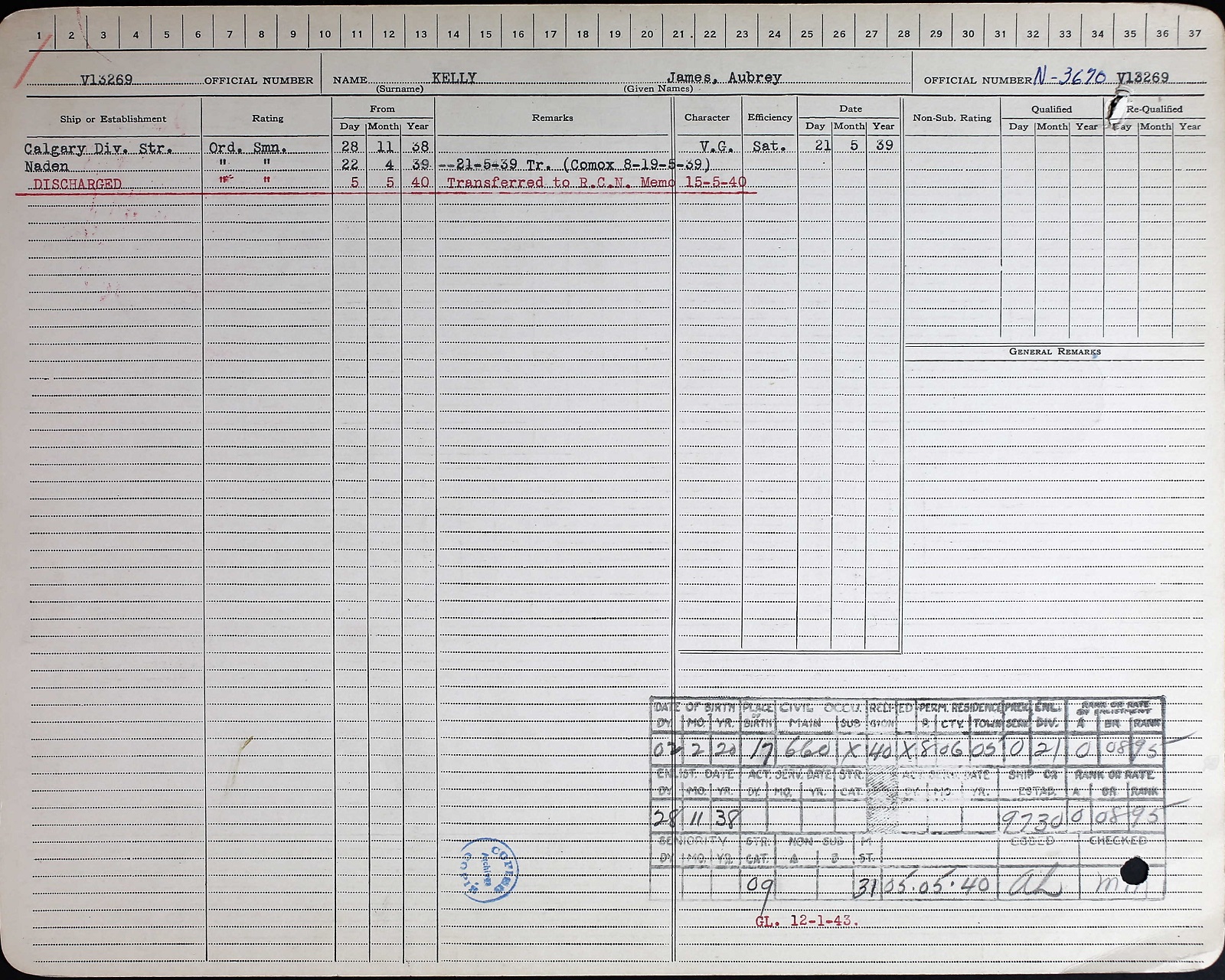 Ships served in: RCNVR DIVISION CALGARY - Enlisted 28 Nov 1938 as an OS, RCNVR * Transferred to the RCN 05 May 1940 HMCS ST FRANCIS - Served in ST FRANCIS 06 May 1941 - 27 Aug 1941 as an A/AB and AB, RCN. Rated AB 29 Jul 1941 HMCS MINAS - Served in MINAS 09 Dec 1941 - 27 Jul 1942 as an AB and A/LS, RCN. Rated A/LS 01 Apr 1942 HMCS ATHABASKAN - Served in ATHABASKAN 04 Feb 1942 - 19 Aug 1943 as an A/LS and LS, RCN. Rated LS 01 Apr 1943 HMCS ATHABASKAN - Drafted to ATHABASKAN 09 Mar 1944 as an A/PO, RCN. Survived the sinking of ATHABASKAN. Rescued / captured by German Naval Forces and became a POW for the remainder of the war HMCS UGANDA - Served in UGANDA 02 Jan 1946 - 27 Jun 1946 as a PO and LS, RCN. HMCS CRESCENT - Drafted to CRESCENT 01 Aug 1946 as a LS, RCN.