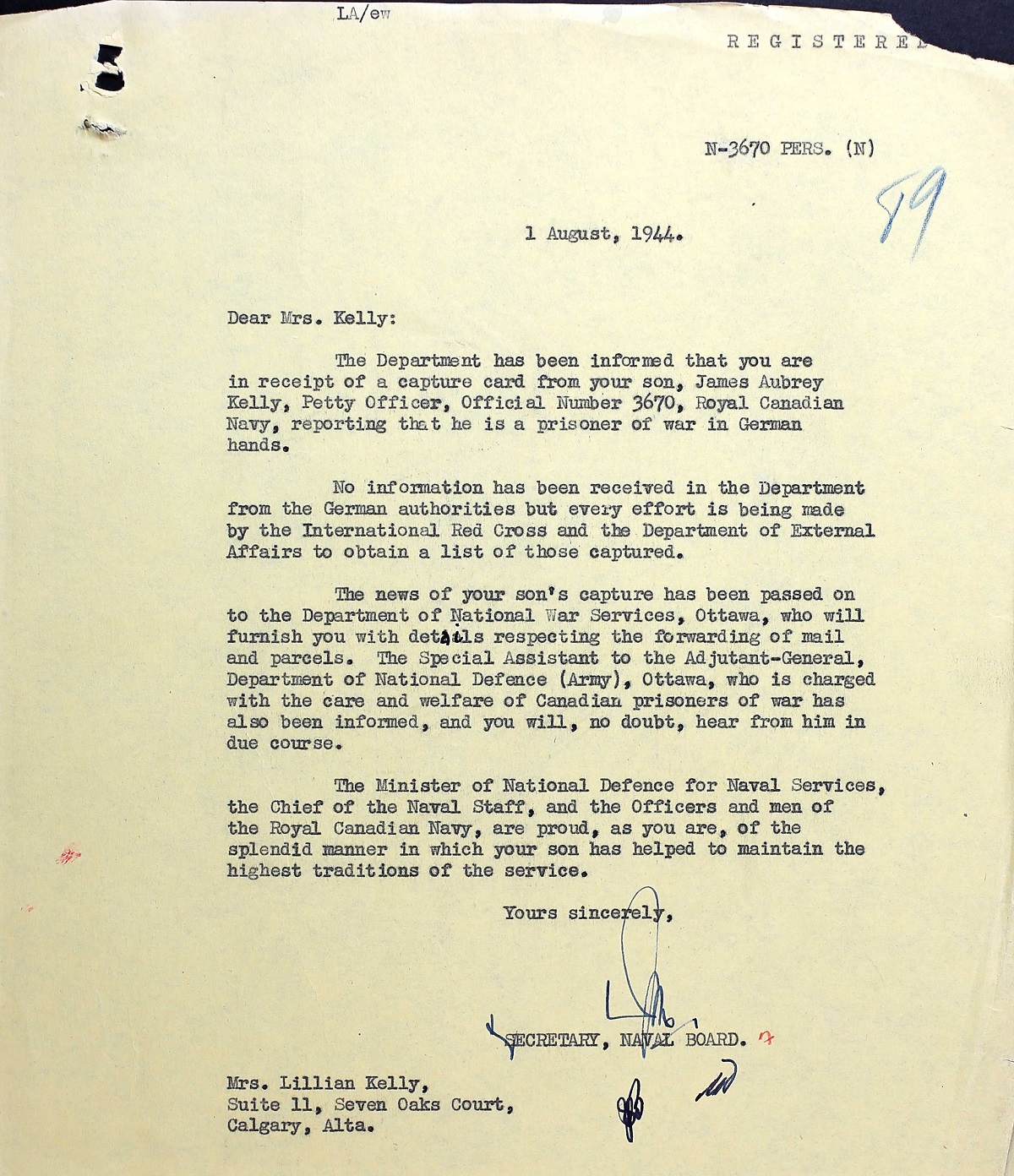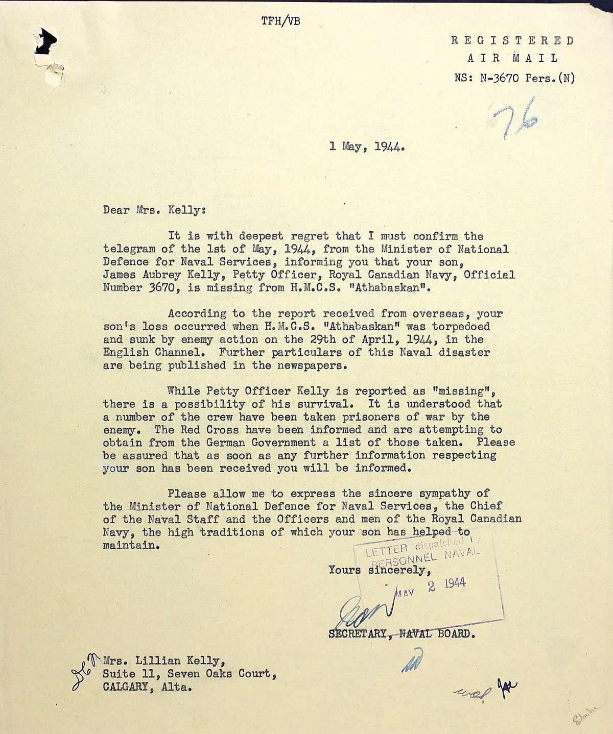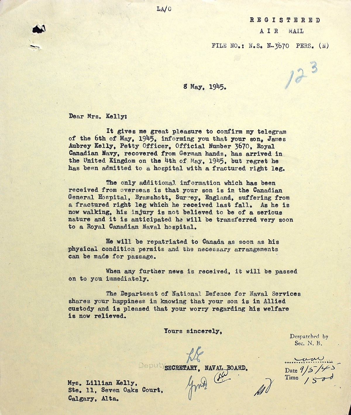 (JK05-JK07) Letters to PO James Kelly's mother informing her that her son is missing after the sinking of HMCS ATHABASKAN; then that he had be captured by German Forces and is a POW; and finally, that he has been freed and is now in the UK