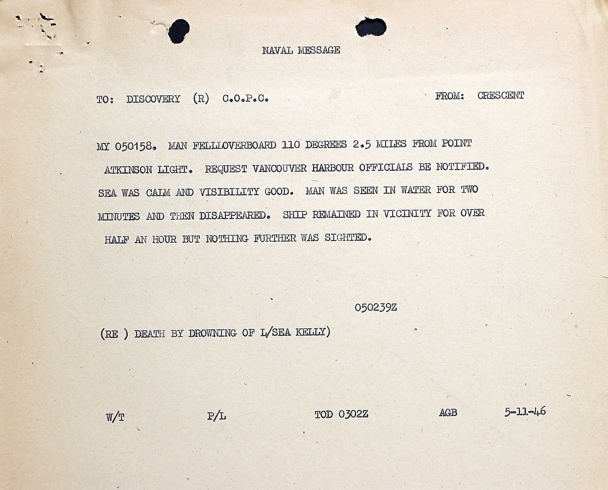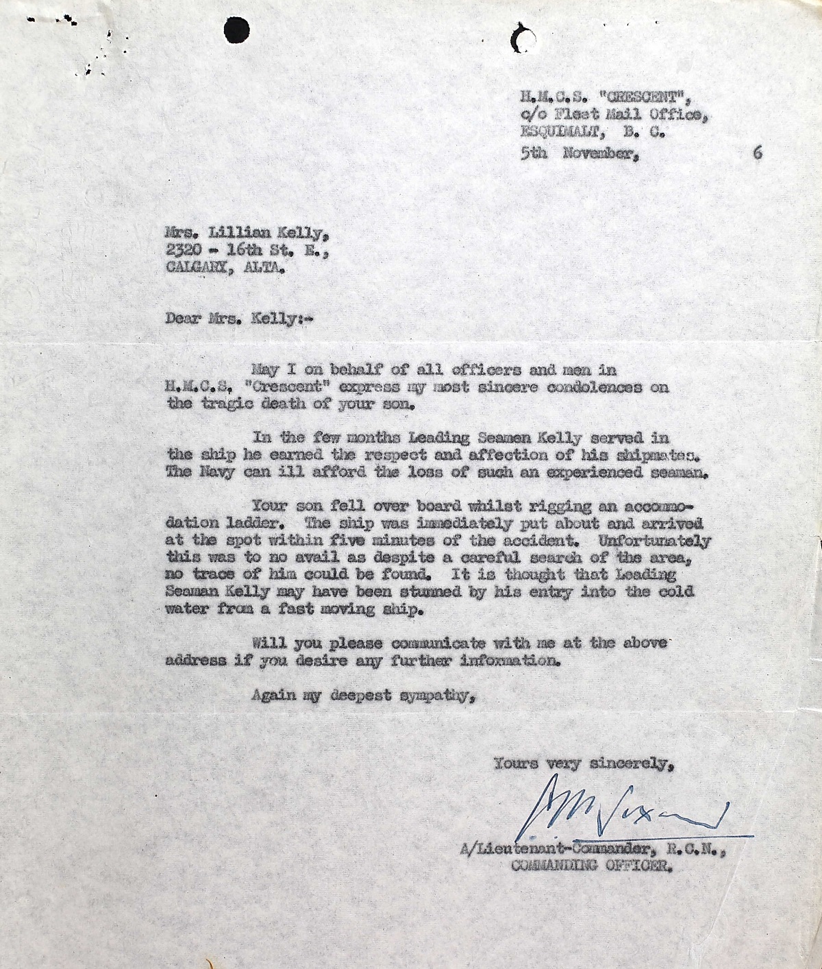 (JK08) Letter of Condolence to LS James Kelly's mother from the CO of HMCS CRESCENT (JK09) Naval Message to HMCS DISCOVERY and C.O.P.C. on the death of LS Kelly