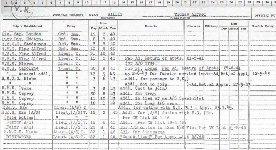 Ships served in: * Prior to joining the RCNVR, Thomas Willis had served in the R.C.C.S., 1st Div, Sigs from 1927 to 1935 achieving the rank of W.O.2 RCNVR DIVISION LONDON - Enlisted 19 Jul 1940. Commenced Active Service 05 Aug 1940 HMCS STADACONA - Drafted to STADACONA 07 Aug 1940 as an OS, RCNVR HMS KING ALFRED - Drafted to KING ALFRED for officer training 13 Sep 1940 as an OS. RCNVR. Appointed Lt, RCNVR 13 Sep 1940 HMS NIMROD - Appointed to NIMROD for A/S course HMS CAROLINE - Appointed to CAROLINE (for ST LOMAN) * Leave - Feb 1942 - 01 Apr 1942 HMS ASSEGAI (RN training facility Durban, South Africa) - Appointed to ASSEGAI 12 May 1943 as a Lt, RCNVR, add'l. HMCS NIOBE - Appointed to NIOBE 03 Jun 1943 as a Lt, RCNVR add'l for passage to UK T.S.M.V. City of Exeter (Ellerman Lines) - for transport from South Africa back to England HMS DRAKE - Appointed to DRAKE 03 Aug 1943 as a Lt, RCNVR, add'l (not to join) HMS OSPREY -Appointed to OSPREY 30 Aug 1943 as a Lt, RCNVR, add'l for training. Re-appointed 11 Oct 1943 add'l in lieu of A/S Specialist. Re-appointed 10 Jan 1944 as add'l for Long A/S course HMS EXE - Appointed to EXE 23 Jan 1945 as a Lt (A/S), RCNVR, add'l for duties with EG G-3. Re-appointed (in place of Lt. Ruttan) 12 Feb 1945 add'l for A/S duties with E.G. Cdr HMS OSPREY - Appointed to OSPREY 16 Jun 1945 as a Lt (A/S), RCNVR, Add'l HMS FAIRY - Appointed to FAIRY 24 Aug 1945 as a Lt (A/S), RCNVR for A/S duties in 42nd M/S Flottilla HMCS NIOBE - Appointed to NIOBE 23 Jan 1946 as a Lt (A/S, RCNVR, add'l for discharge *Demobilized 23 Jan 1946 as a Lt, RCN(R) (Navy List Apr 1946)