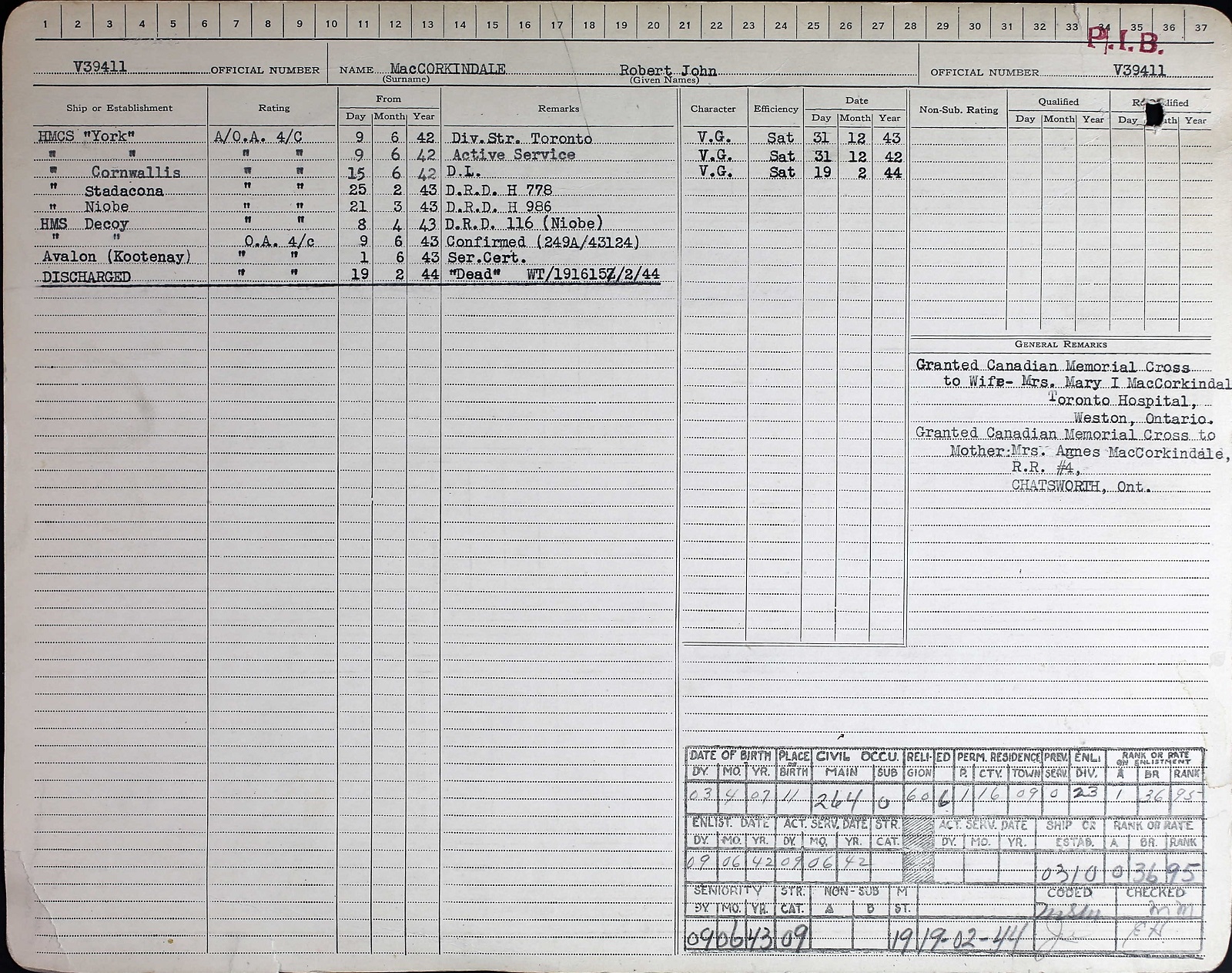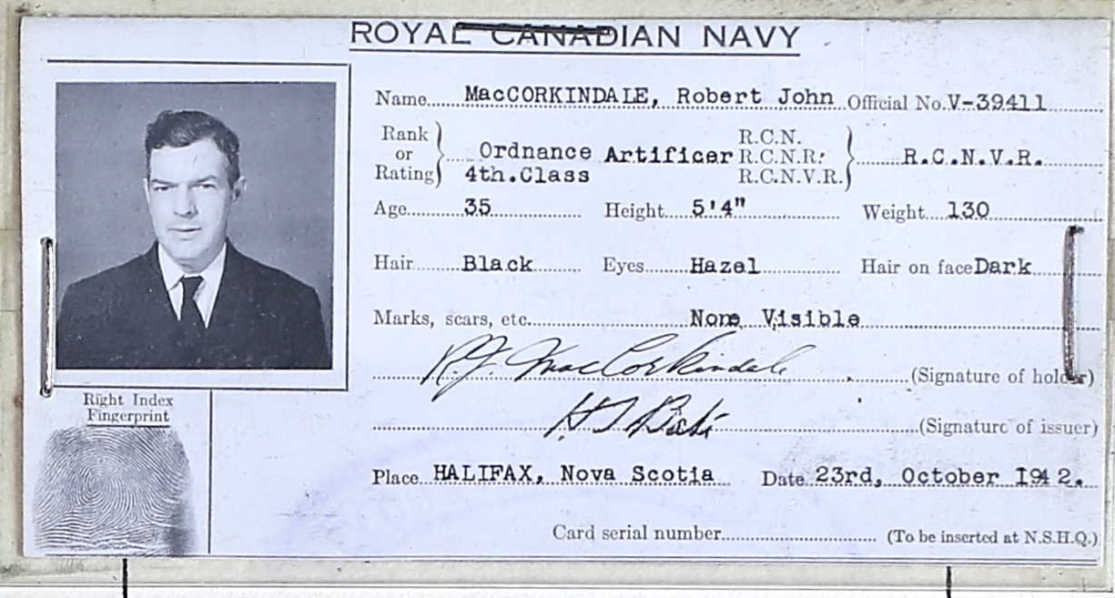 MacCORKINDALE, Robert John, OA, V39411, RCNVR, MPK - 19 Feb 1944, HMCS KOOTENAY - Son of John Hugh MacCorkindale, and of Agnes Reid MacCorkindale, of Chatsworth, ON; husband of Mary I. MacCorkindale, of Port Elgin, ON.