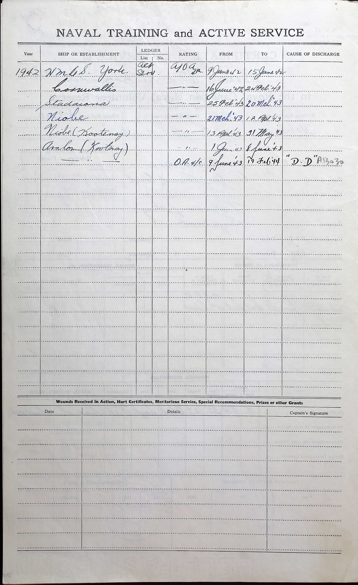Ships served in: HMCS YORK - Enlisted 09 Jun 1942. Commenced Active Service 09 Jun 1942 HMS DECOY / HMCS KOOTENAY - Drafted to decoy 08 Apr 1943 as an A/OA 4c, RCNVR. DECOY transferred to the RCN on 12 Apr 1943 and re-named HMCS KOOTENAY. Rated OA 4c 09 Jun 1943