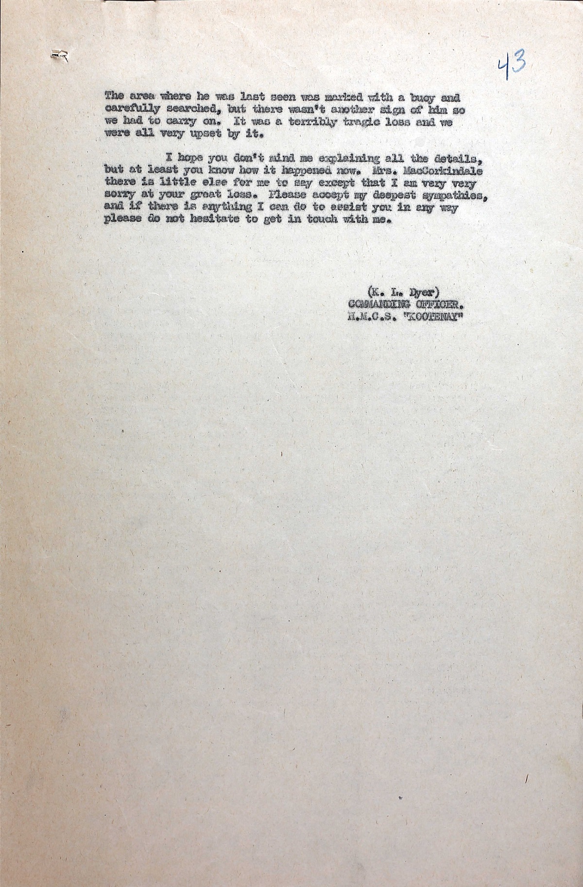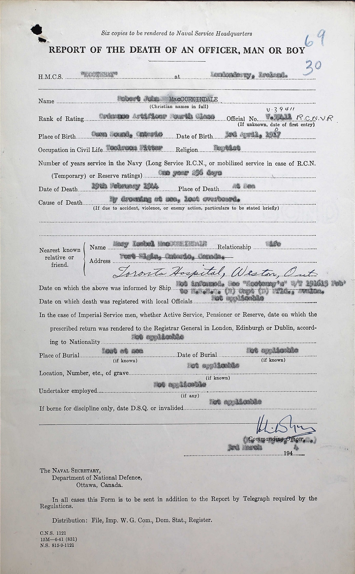 (RM06) Report of Death (RM07) C.O.'s report on the death of OA MacCorkindale (RM08-RM09) Letter to OA Robert MacCorkindale's widow