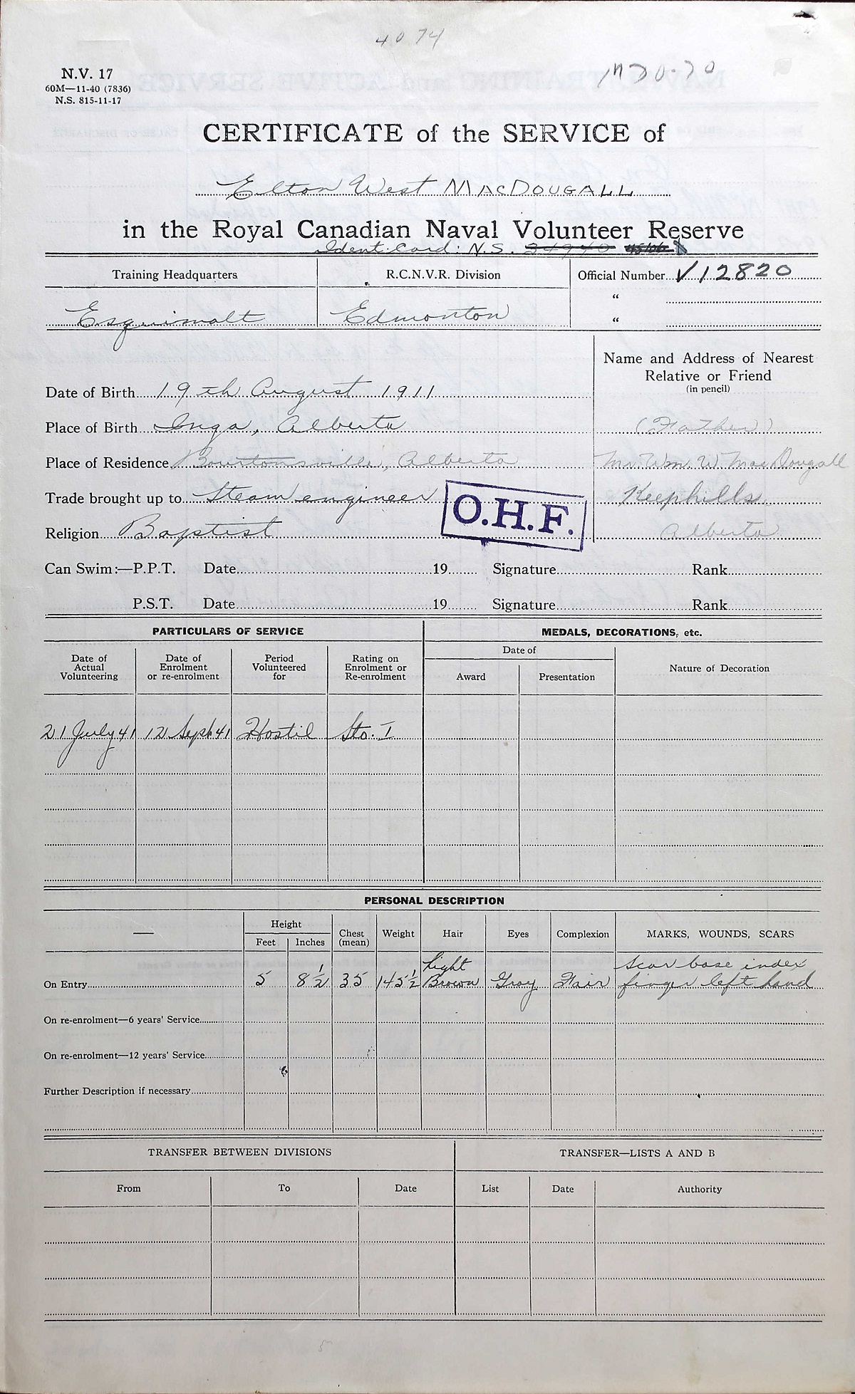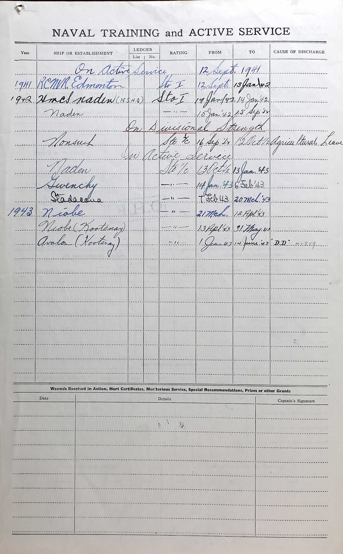 Ships served in: EDMONTON DIVISION RCNVR - Enlisted 12 Sep 1941. Commenced Active Service 12 Sep 1941 HMCS NONSUCH - On Divisional Strength - 12 Sep 1942 - 12 Oct 1942 - Agricultural Leave. Active Service 13 Oct 1942 HMCS GIVENCHY - Served in GIVENCHY 14 Jan 1943 - 06 Feb 1943 as a Sto 1c, RCNVR HMCS KOOTENAY - Drafted to KOOTENAY 13 Apr 1943 as a Sto 1c, RCNVR