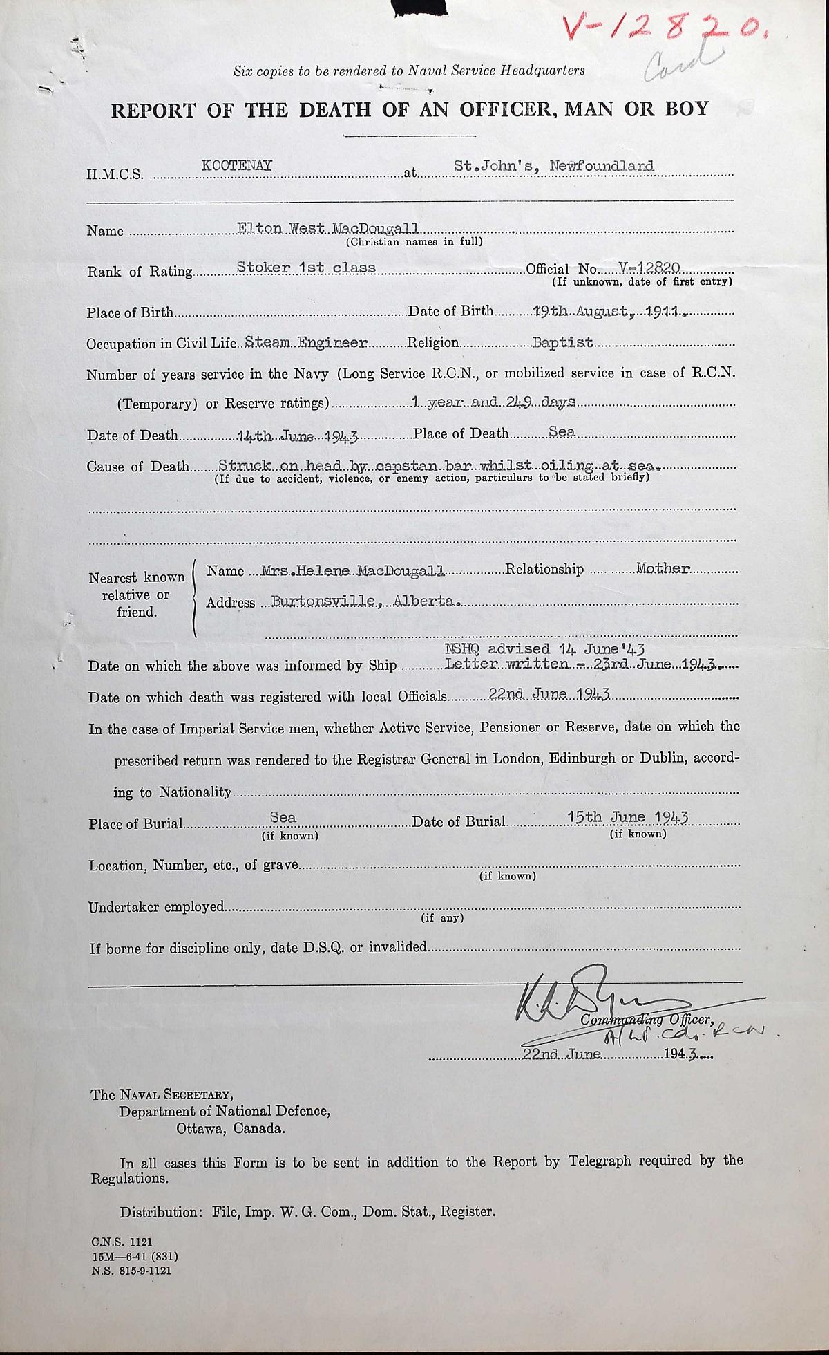 Stoker MacDougall died when he was struck in the head by the capstan bar while taking part in a refueling on HMCS KOOTENAY. The capstan had slipped into reverse. He was buried at sea.