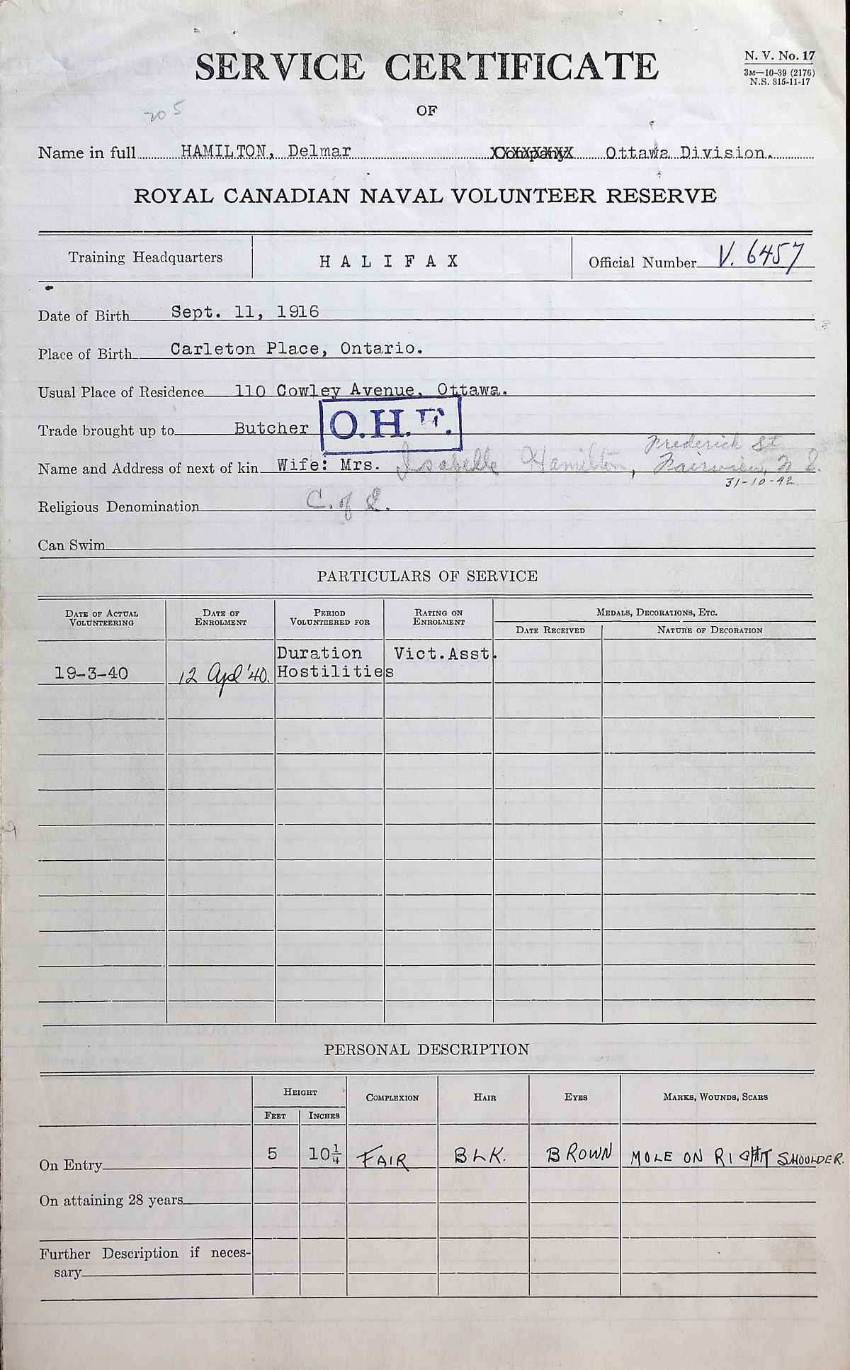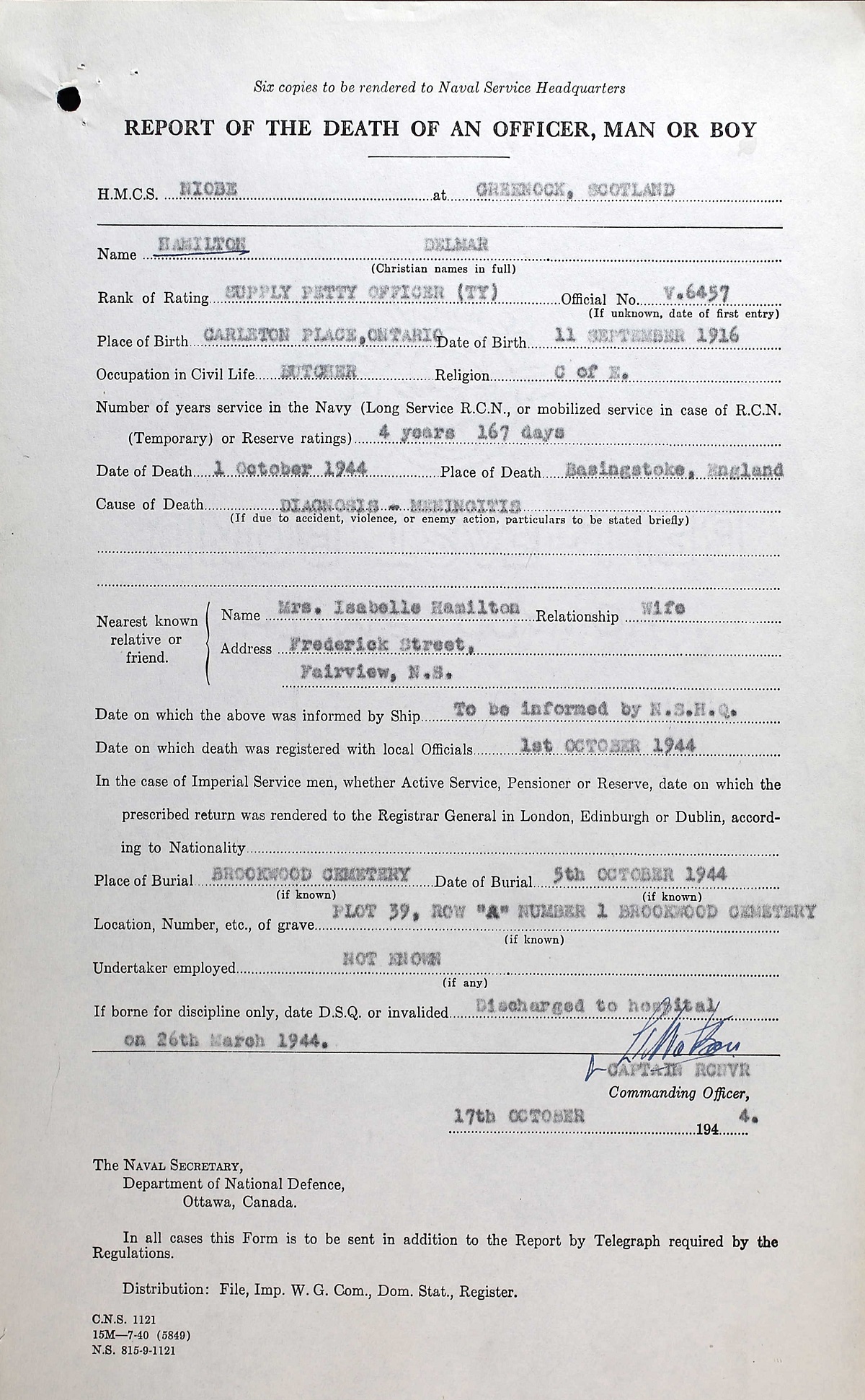 HAMILTON, Delmar Supply PO, V6457, RCNVR died - 01 Oct 1944, HMCS RESTIGOUCHE - Son of Joshua and Eliza Ann Hamilton; husband of Isabell Evelyn Hamilton, all of Montreal, QC.
