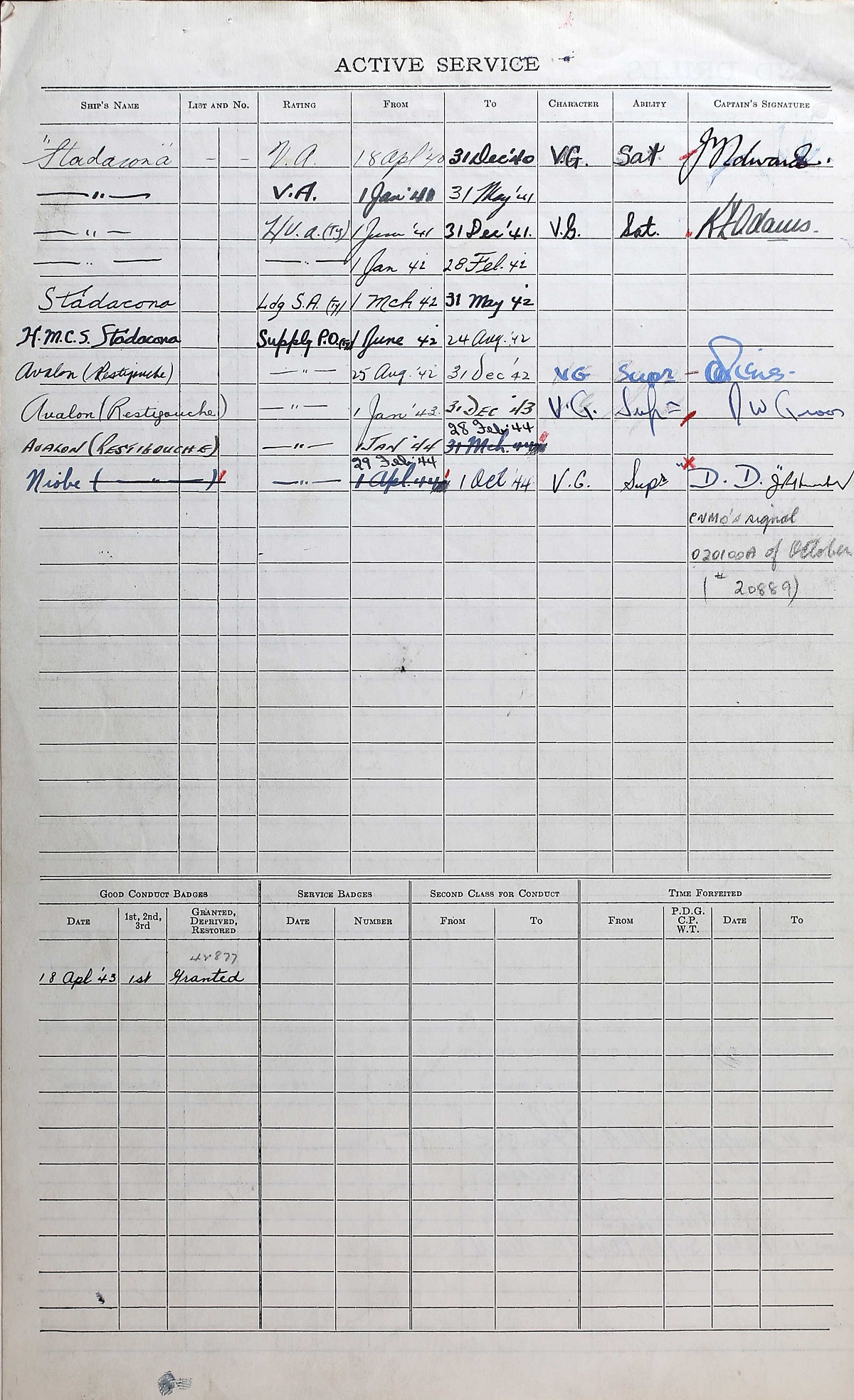 Ships served in: RCNVR DIVISION OTTAWA - Enlisted 12 Apr 1940 as a Victualling Assistant, RCNVR HMCS RESTIGOUCHE - Drafted to RESTIGOUCHE 25 Aug 1942 as a Supply Petty Officer, RCNVR HMCS NIOBE - Landed to NIOBE for medical treatment