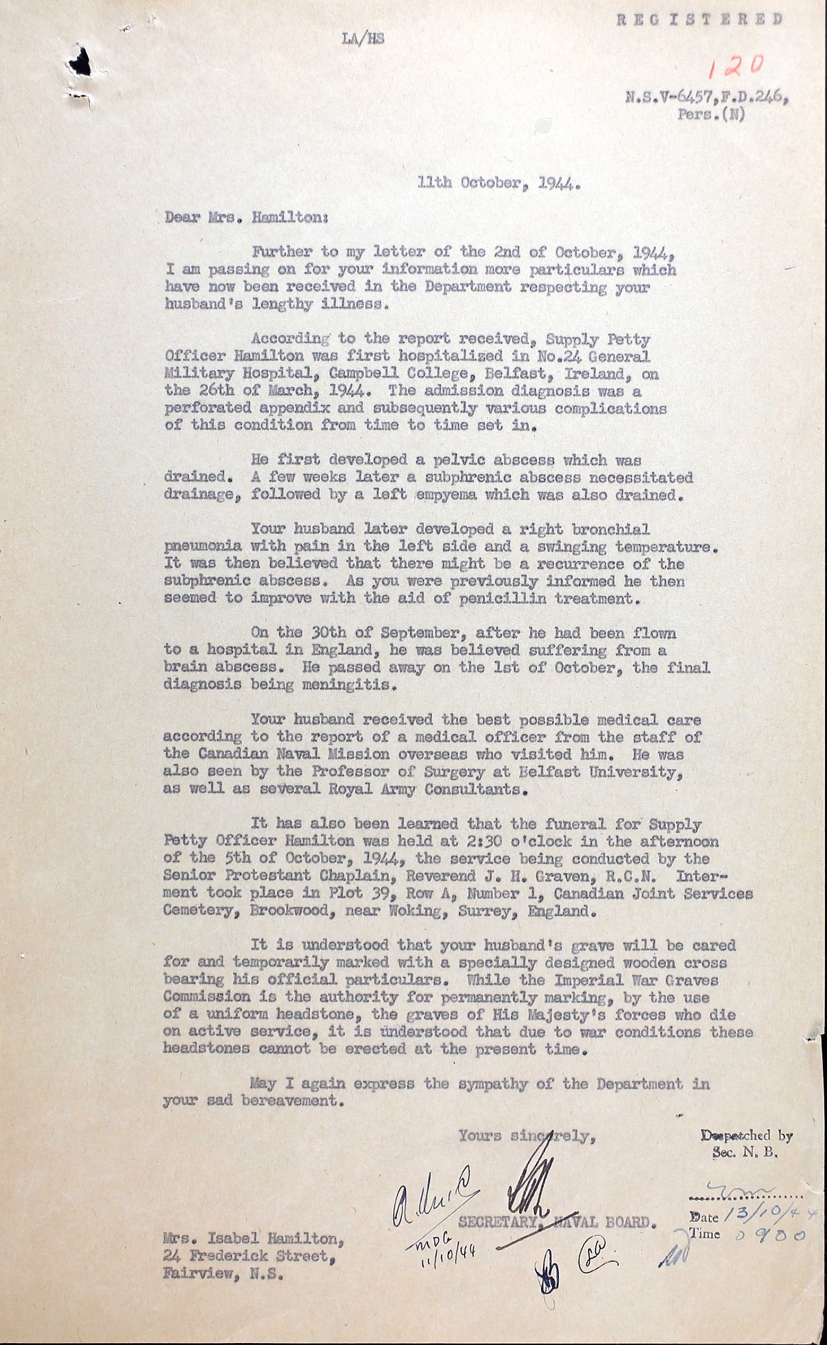 Petty Officer Hamilton died at the Basingstoke Neurological & Plastic Surgery Hospital, Basingstoke, Hampshire, England due to meningitis. He is buried in the Brookwood Military Cemetery, Surrey, England.