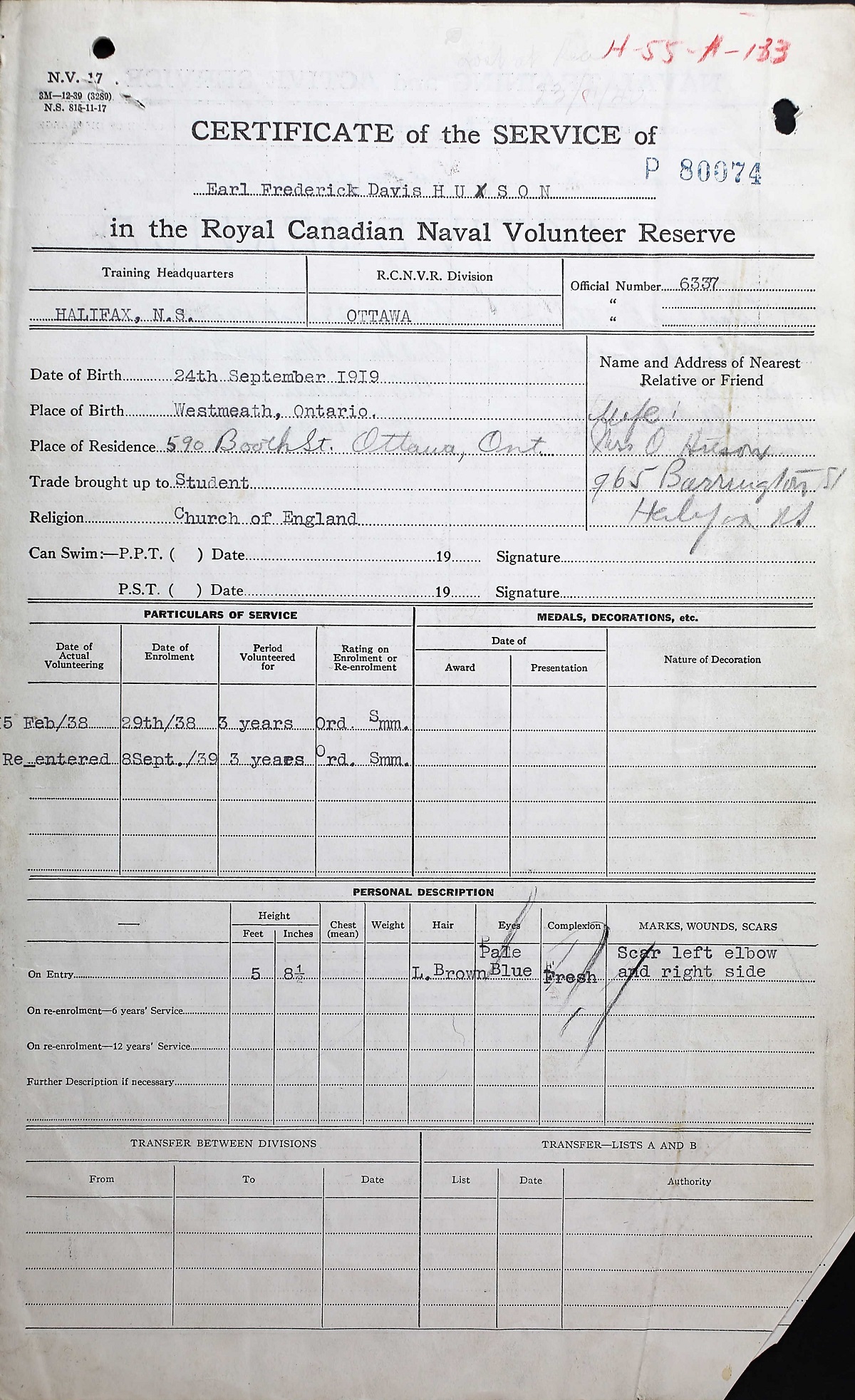 Able Seaman Earl Frederick Davis Huson joined the R.C.N.V.R. in 1937 and went to sea on September 25, 1939. He was born in Westmeath, Ontario. His parents live in Ottawa. He was educated at the Ottawa Technical High School in the Industrial Course, 1935-1938. He had served in the non-Permanent active Militia as L-Cpl, in the Cameron Highlanders of Ottawa, from June 1935, to November 1937. He worked for some time in the assembly shop of the Aircraft Division of the Ottawa Car Manufacturing Company in 1939. He was married in April 1940, to Delores Ola Louise Thornton, by whom he is survived at Halifax, N.S.