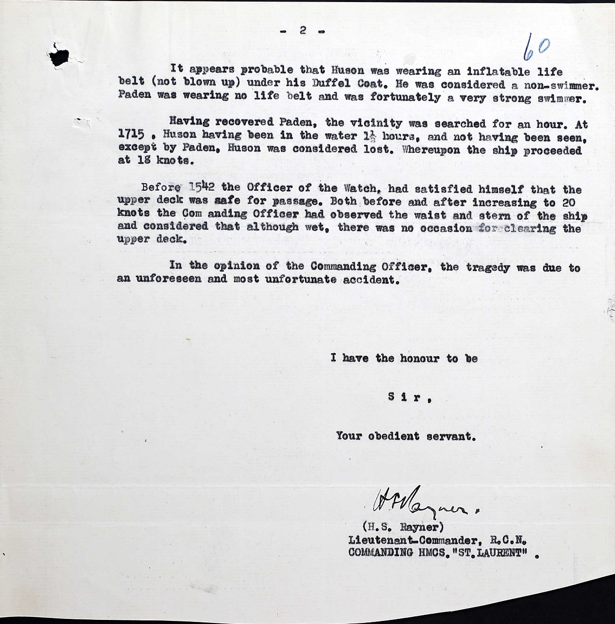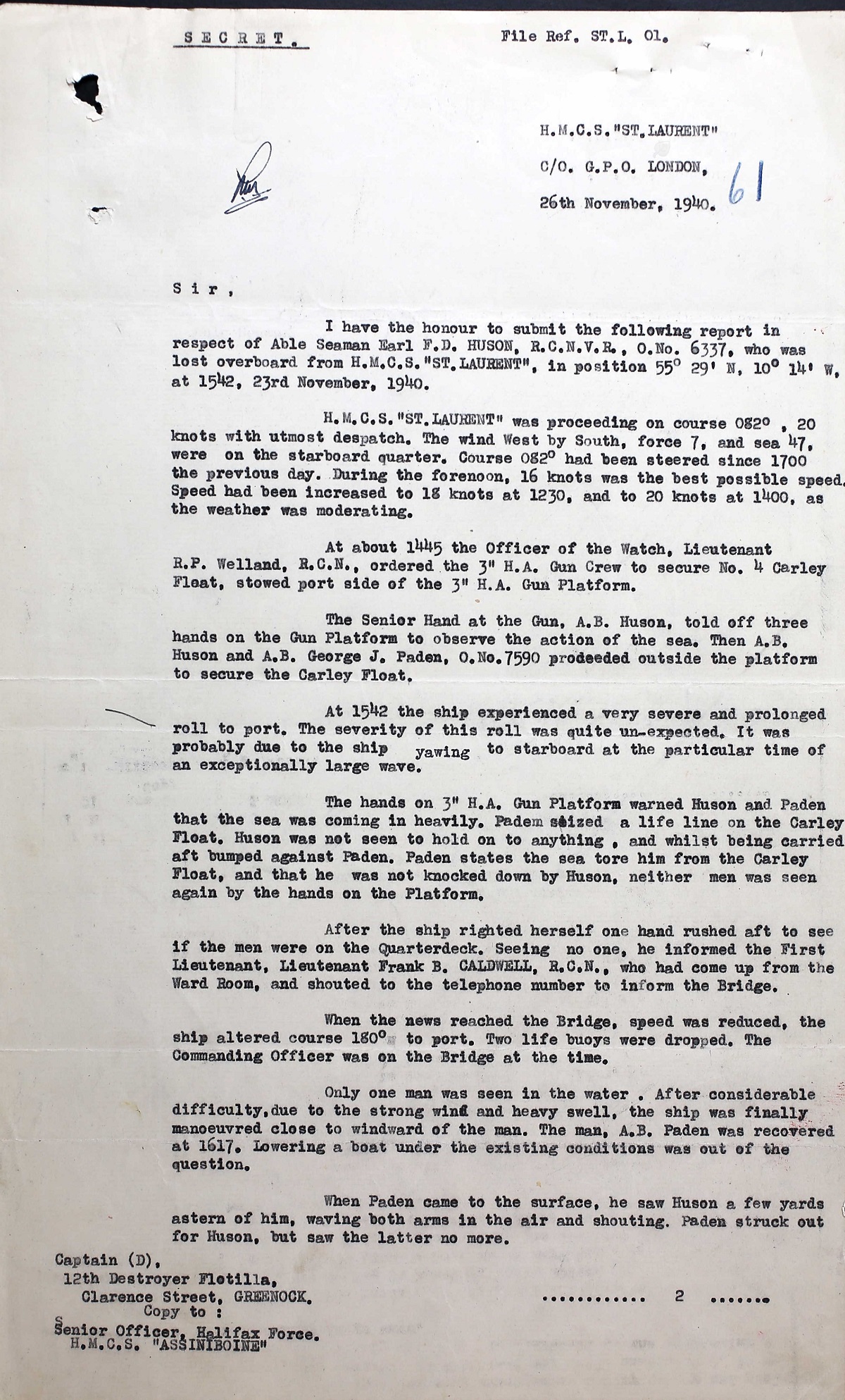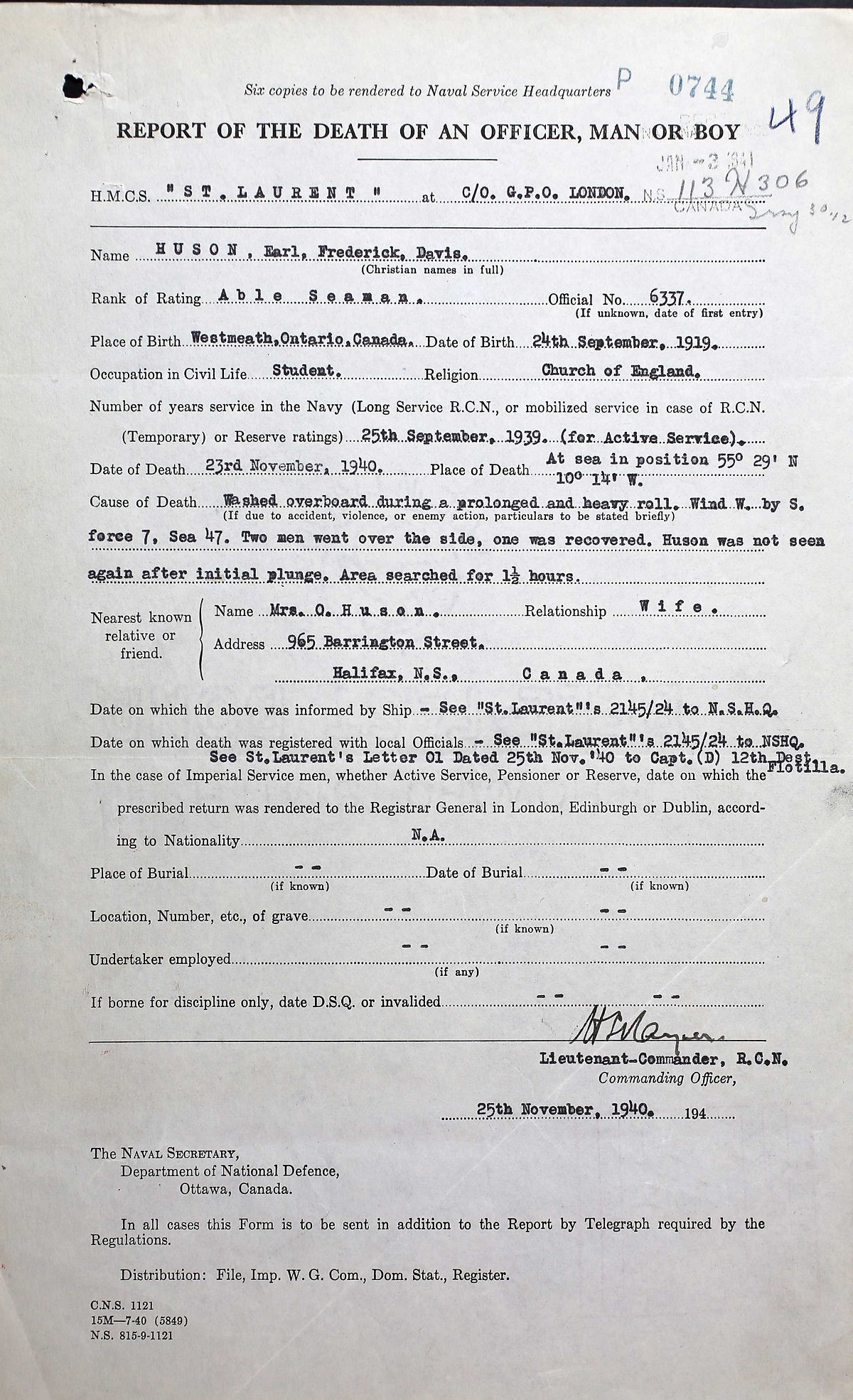 HUSON, Earl Frederick Davis, AB, V6337, RCNVR, MPK - 23 Nov 1940, HMCS ST LAURENT - Son of Edward Victor and Anna Mary Huson, of Ottawa, ON; husband of Ola Louise Huson, of Halifax, NS.